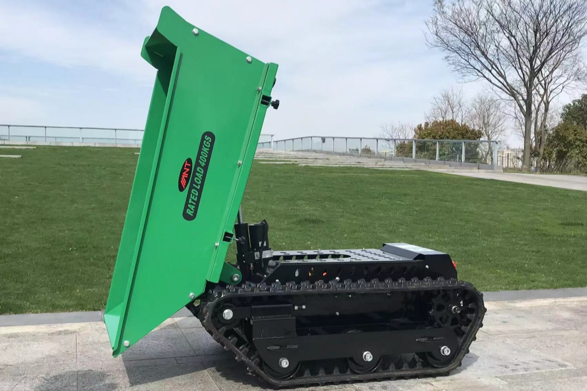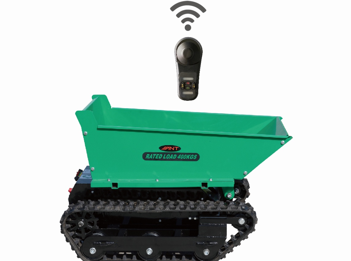 Мини-думпер ANT eBY400 оборудован вместительным бункером на 400 кг со съёмными бортами, что позволяет перевозить грузы различной формы и габаритов. Автоматическая выгрузка бункера обеспечивает быстрое сваливание груза в нужном месте в необходимой пропорции. Гусеничное шасси, приводимое в движение двумя электромоторами мощностью 0,8 кВт каждый, наделяет думпер необходимой данному классу техники проходимостью и маневренностью. Управляется думпер дистанционно при помощи интуитивно понятного и простого в освоении джойстика, что очень удобно при проведении специальных работ где нахождение оператора в непосредственной близи от думпера нежелательно, либо опасно для его жизни и здоровья. Современная литий-ионная батарея ёмкостью 45 а/ч хорошо держит заряд и даёт возможность эксплуатировать думпер в зависимости от нагрузки от 3 до 6 часов. В комплект поставки входит зарядное устройство для подзарядки батареи от стандартной розетки 220 В.