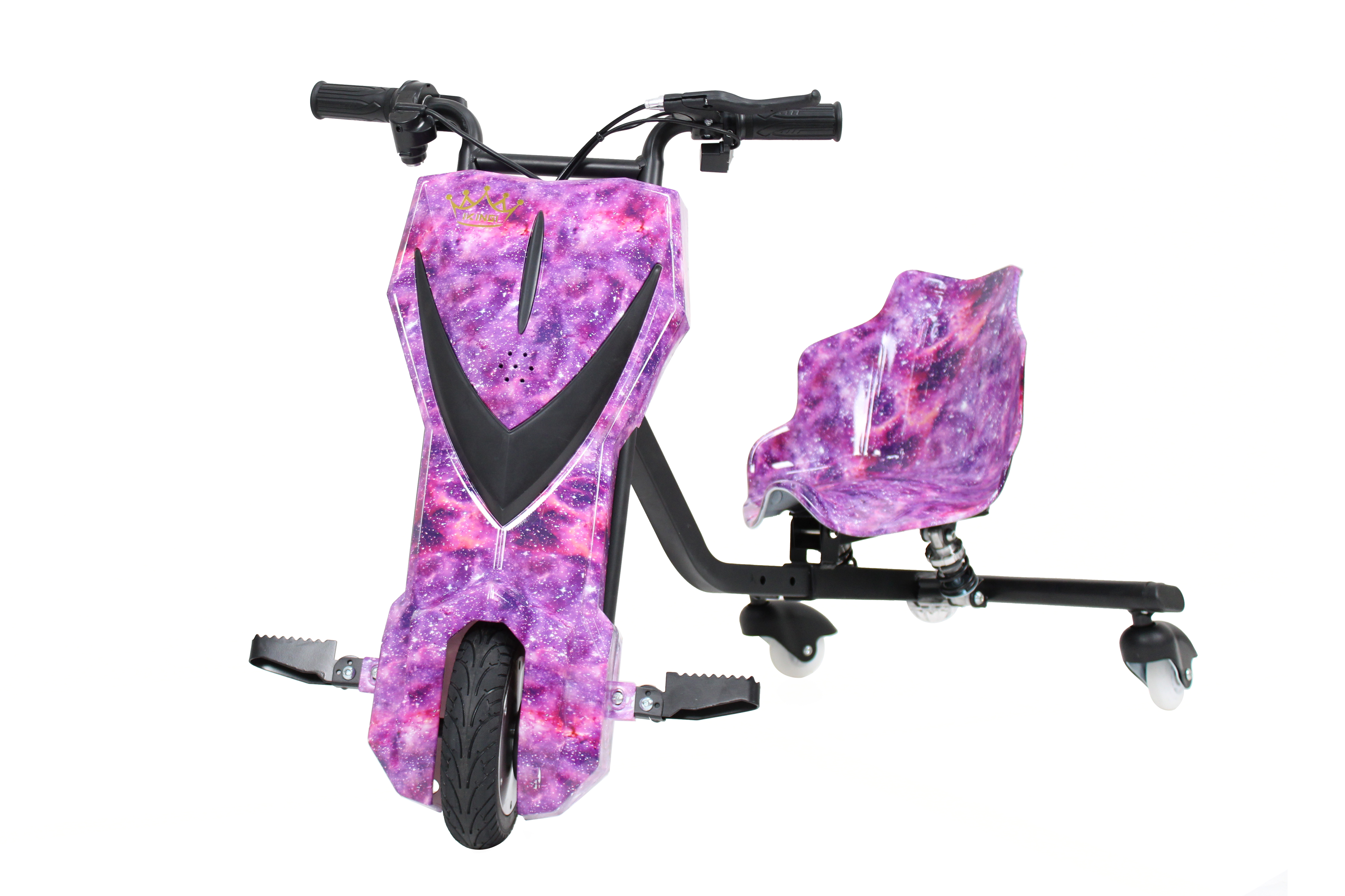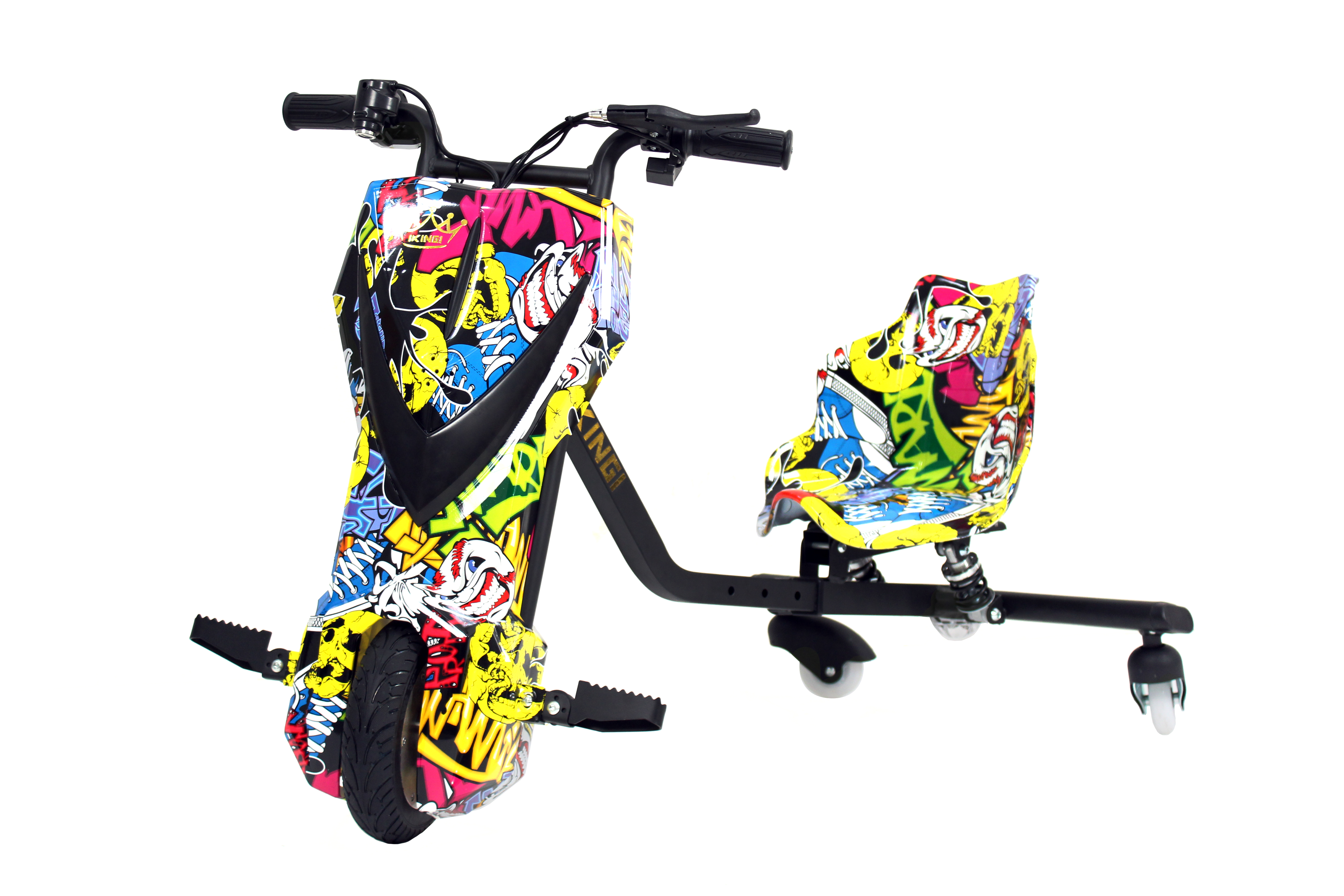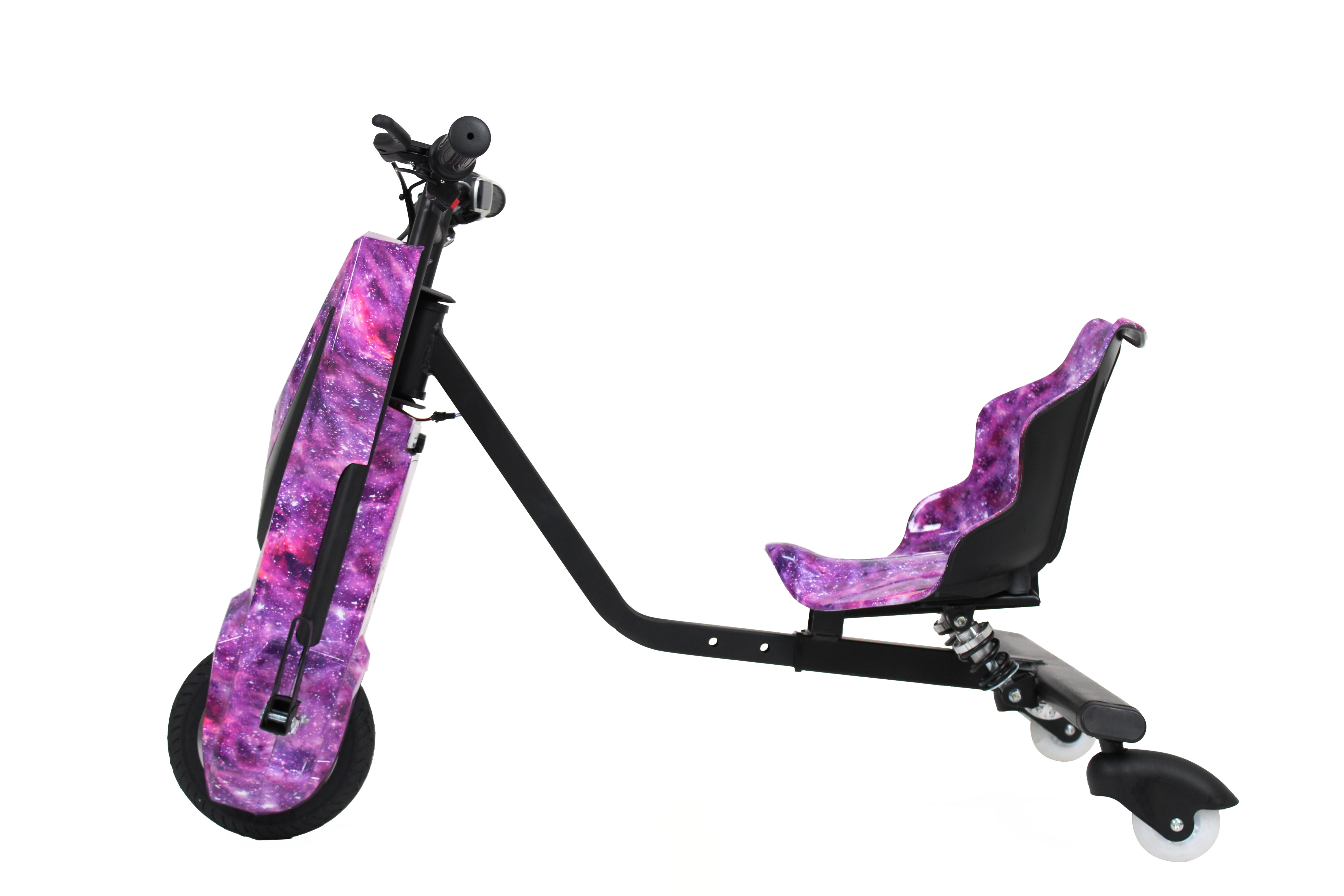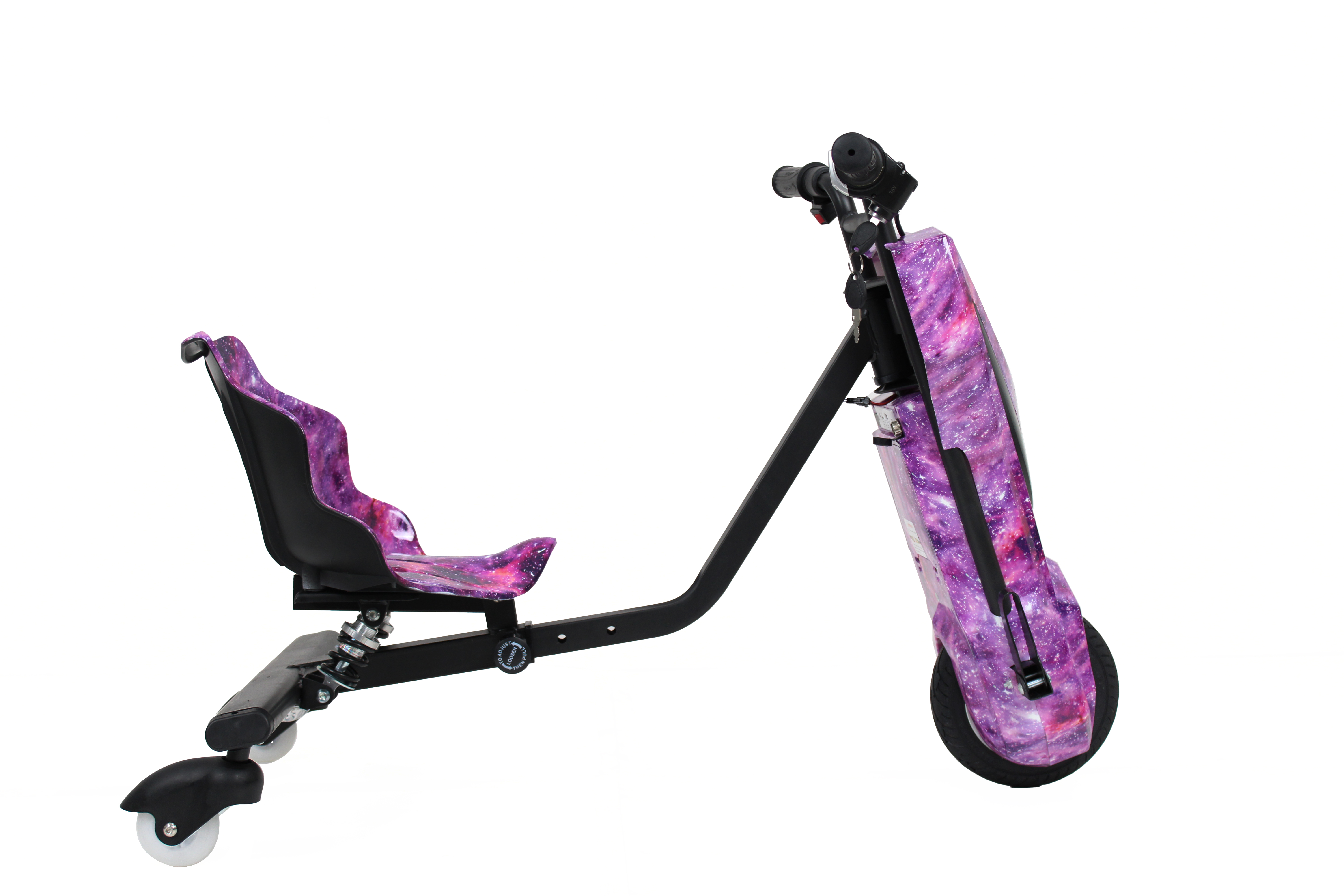 Необычный трицикл, который точно понравится Вашим детям! Достаточно нажать на кнопку на руле - и Вы уже делаете крутые развороты на месте и входите на нем в управляемый занос в поворотах. 350-ваттный мотор позволяет развивать скорость вплоть до 20 км/ч, а литиевый аккумулятор позволяет наслаждаться катанием на протяжении более часа. Однако при этом трицикл безопасен для ваших детей. Удобное сиденье плотно охватывает райдера и надежно держит его при самых умопомрачительных пируэтах. Рама трицикла сделана из прочной стали, а кожух двигателя - из ударопрочного пластика, который не боится случайных ударов и столкновений.