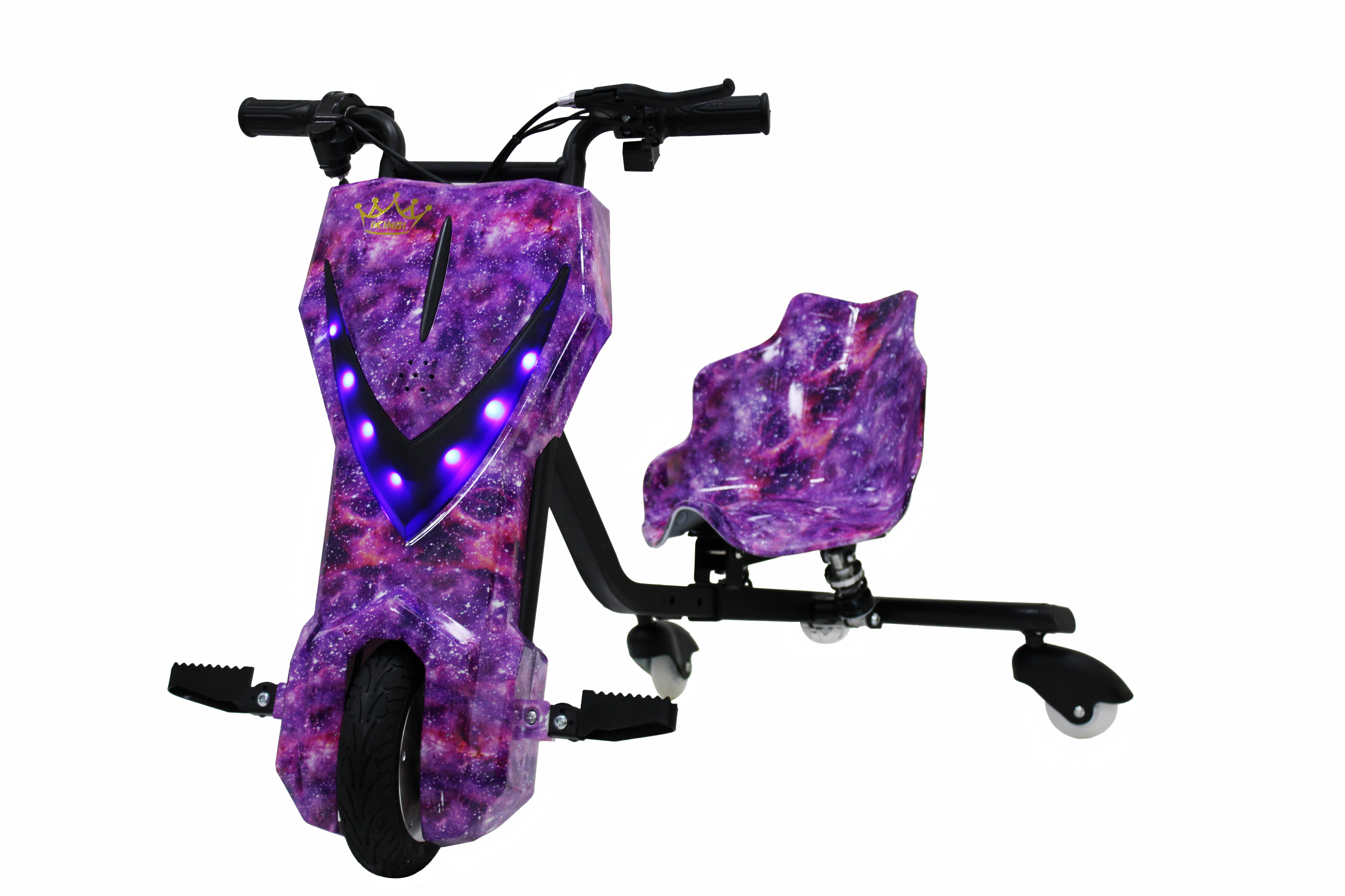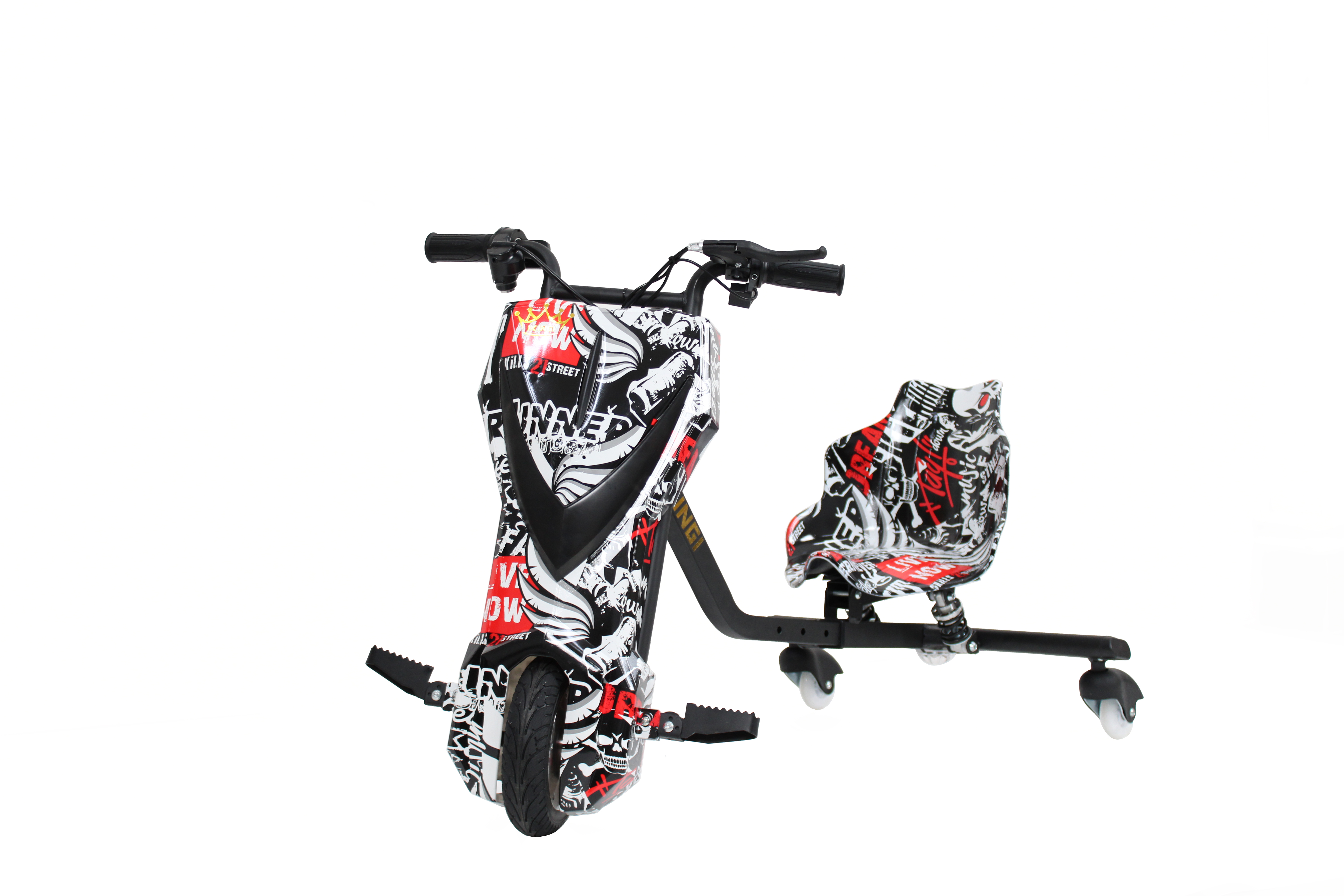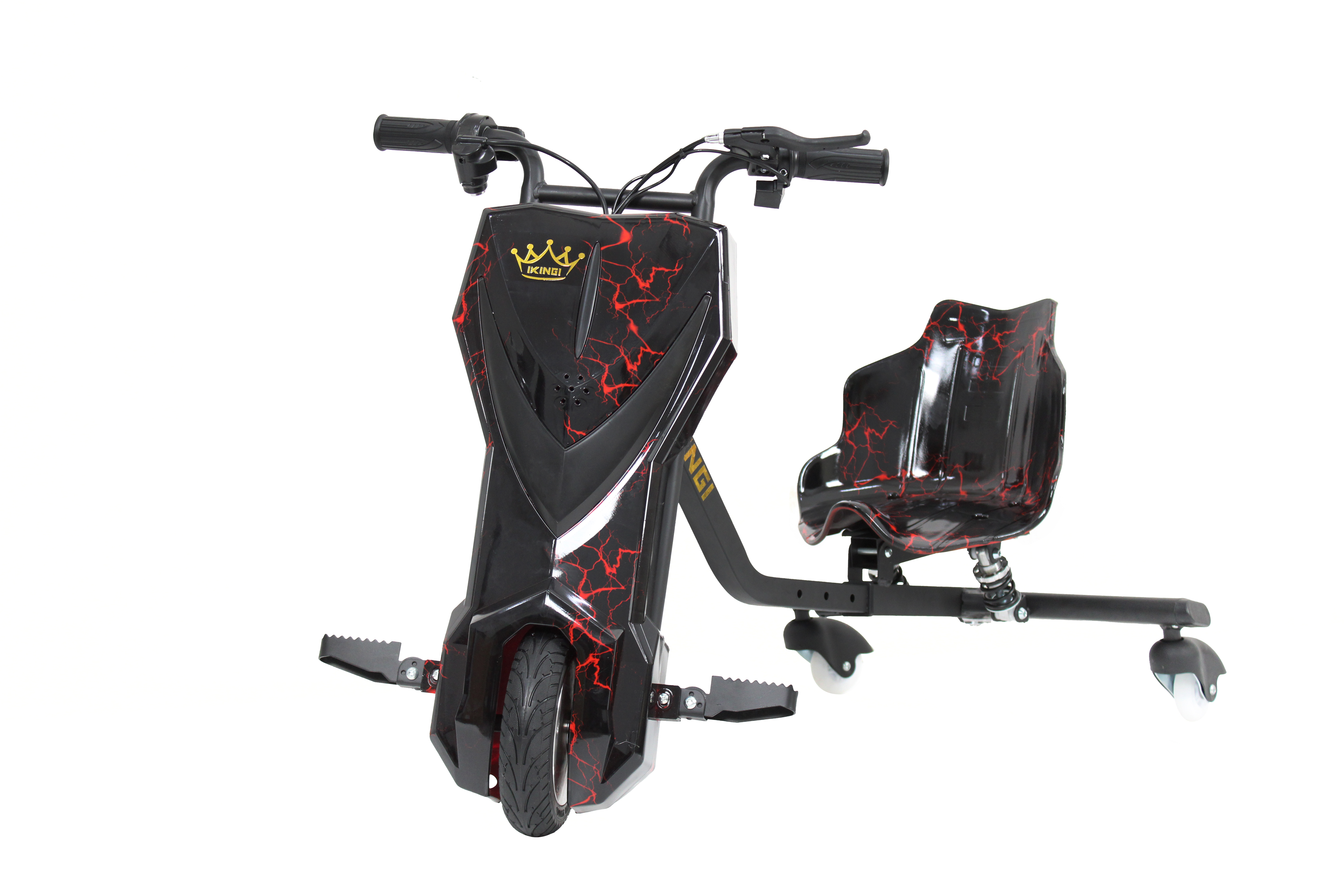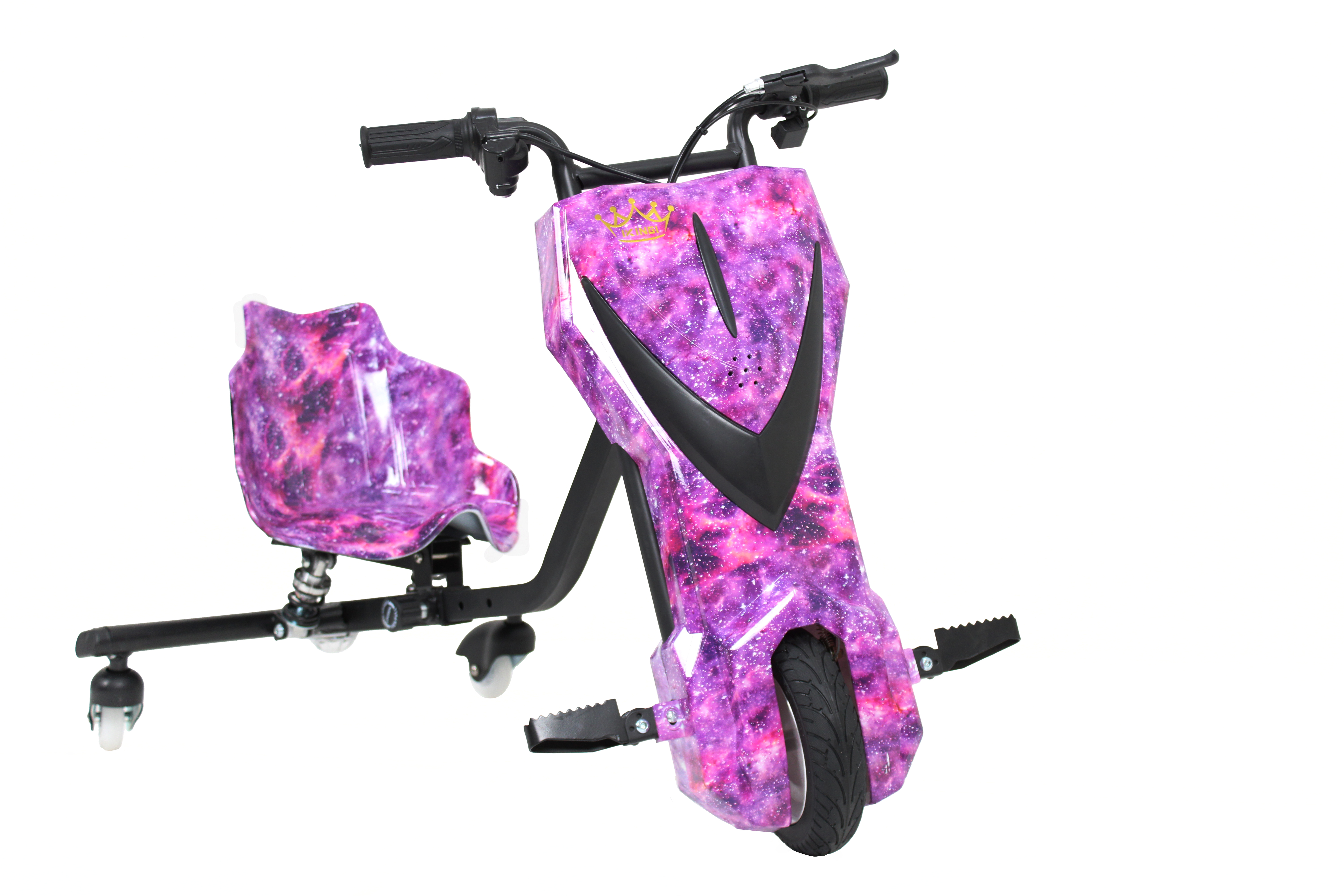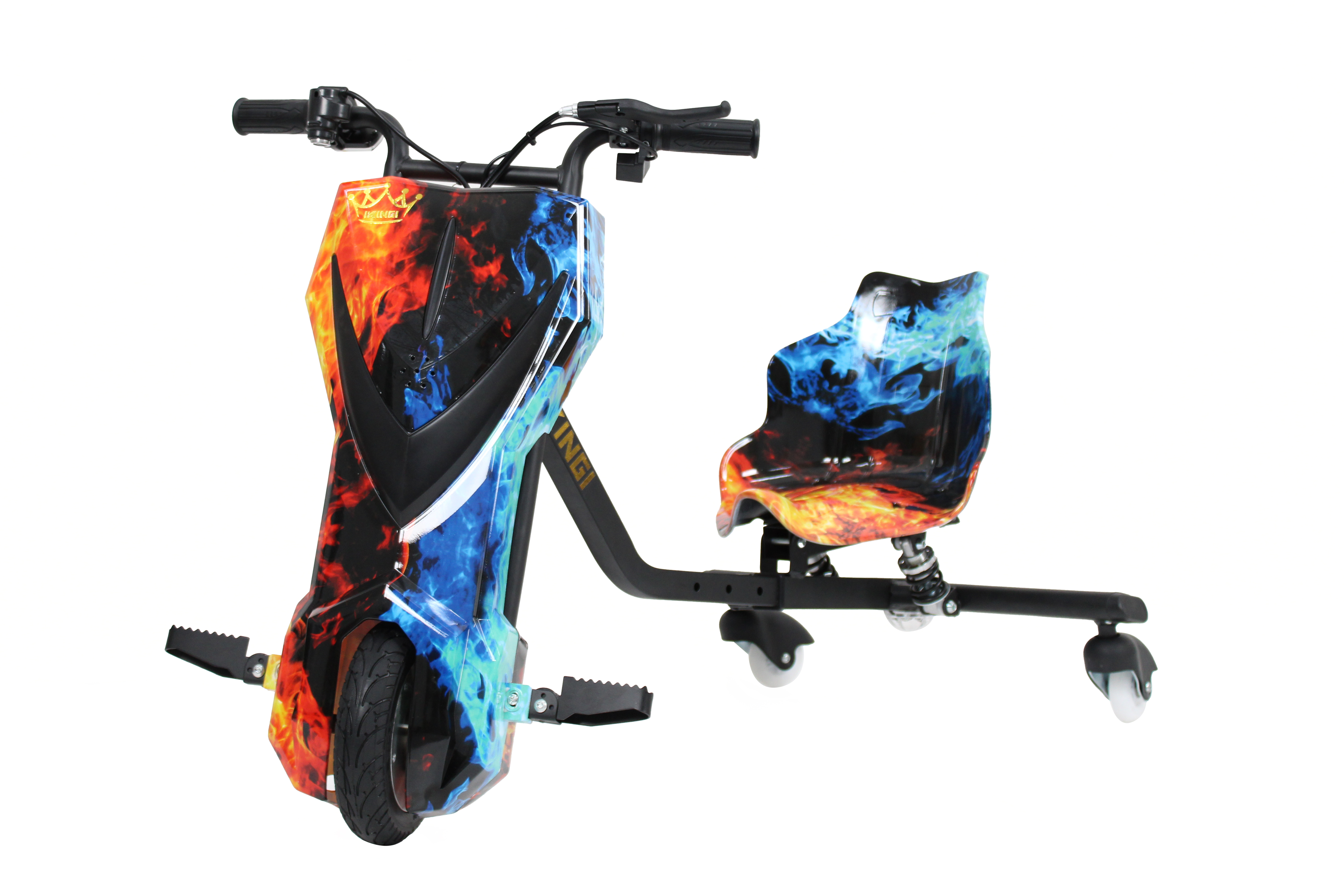 Необычный трицикл, который точно понравится Вашим детям! Достаточно нажать на кнопку на руле - и Вы уже делаете крутые развороты на месте и входите на нем в управляемый занос в поворотах. 350-ваттный мотор позволяет развивать скорость вплоть до 20 км/ч, а литиевый аккумулятор позволяет наслаждаться катанием на протяжении более часа. Однако при этом трицикл безопасен для ваших детей. Удобное сиденье плотно охватывает райдера и надежно держит его при самых умопомрачительных пируэтах. Рама трицикла сделана из прочной стали, а кожух двигателя - из ударопрочного пластика, который не боится случайных ударов и столкновений.
