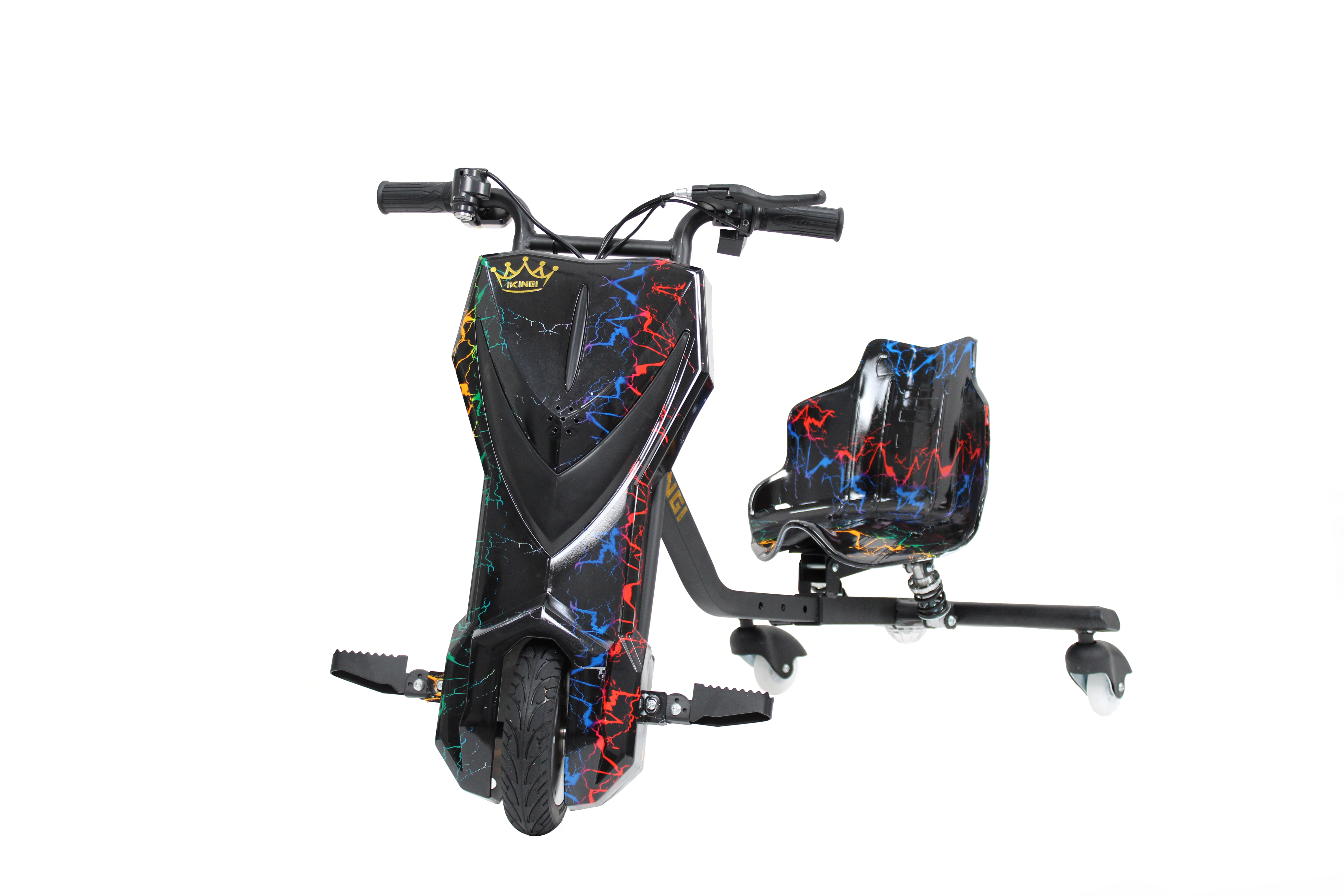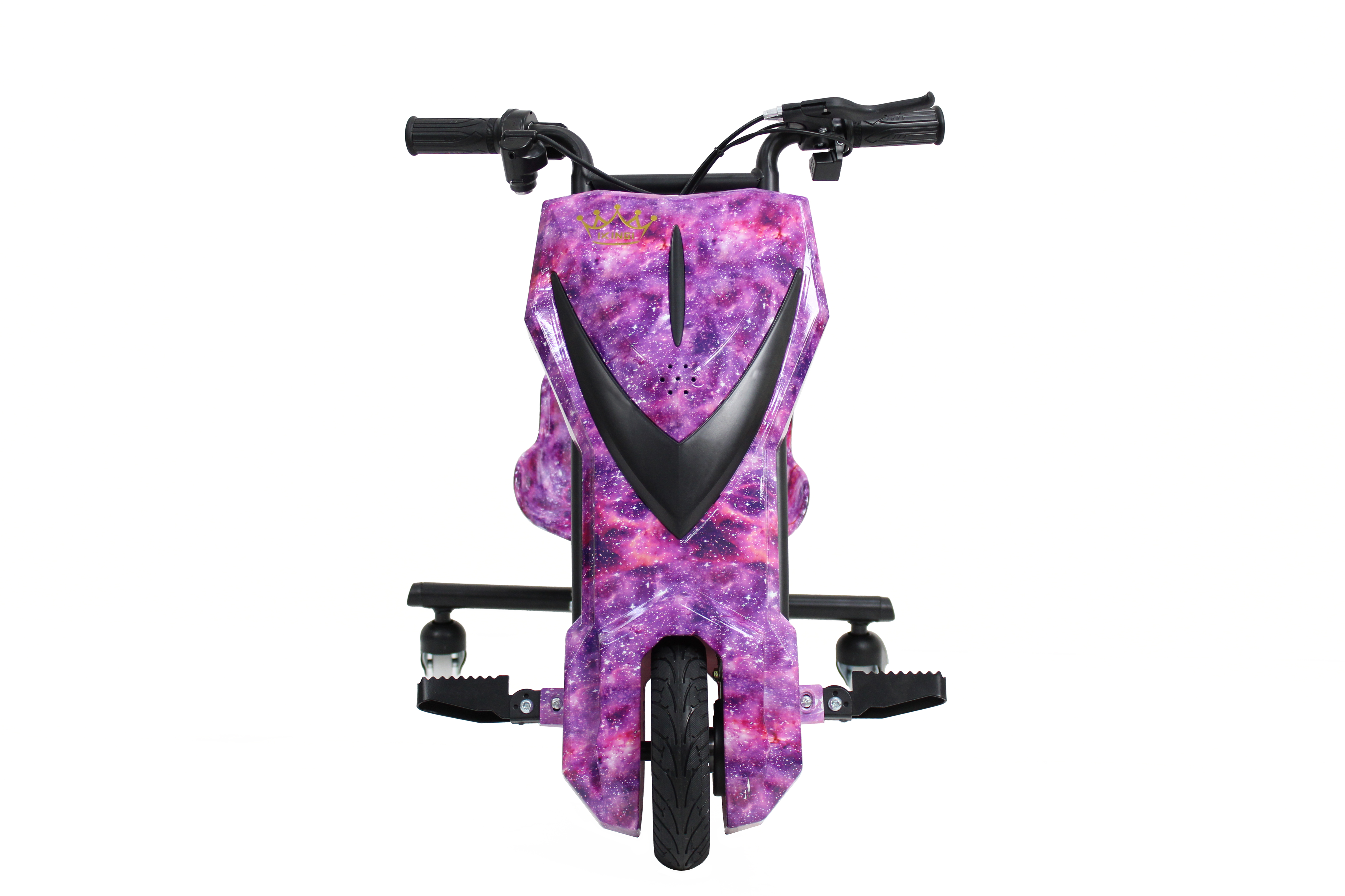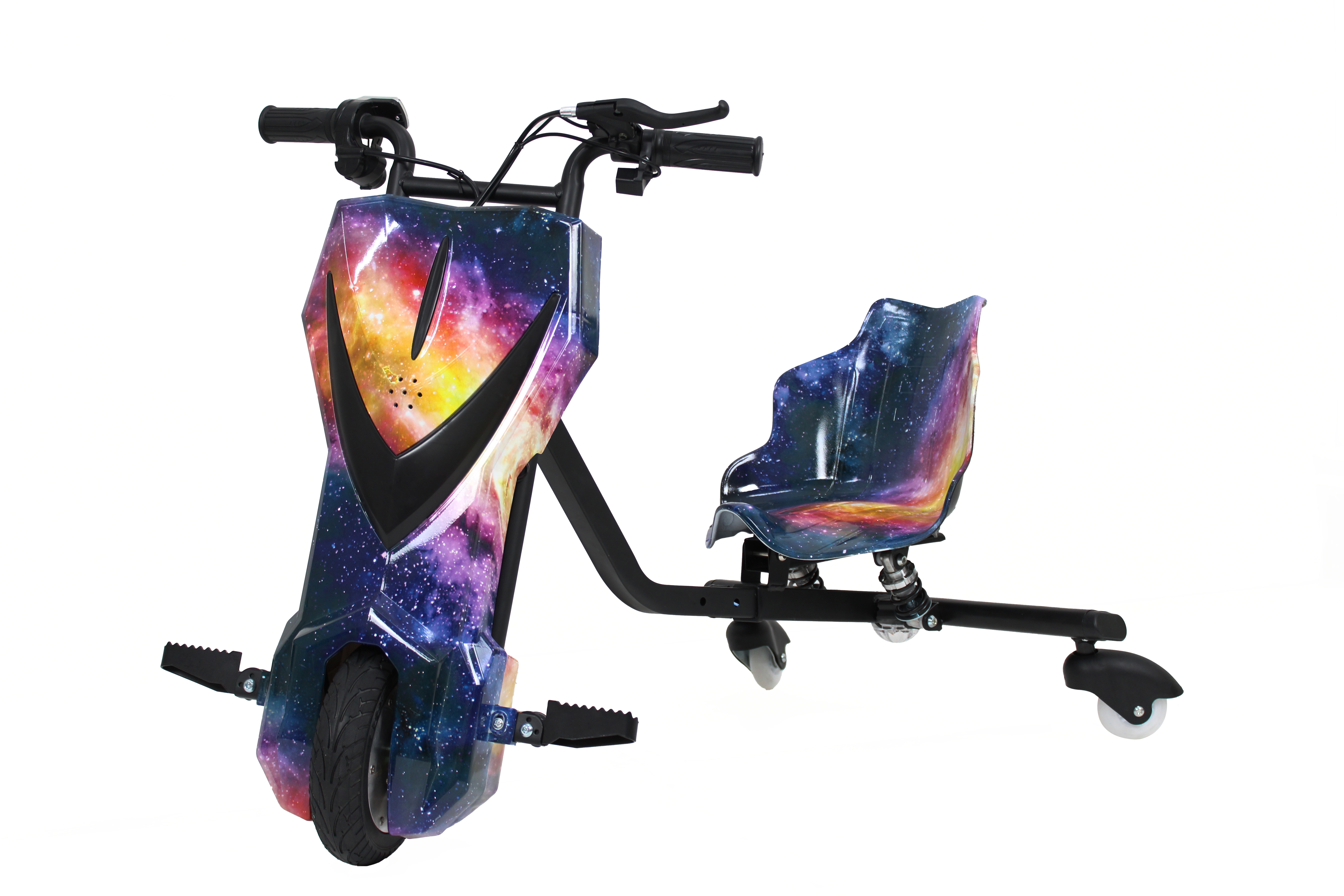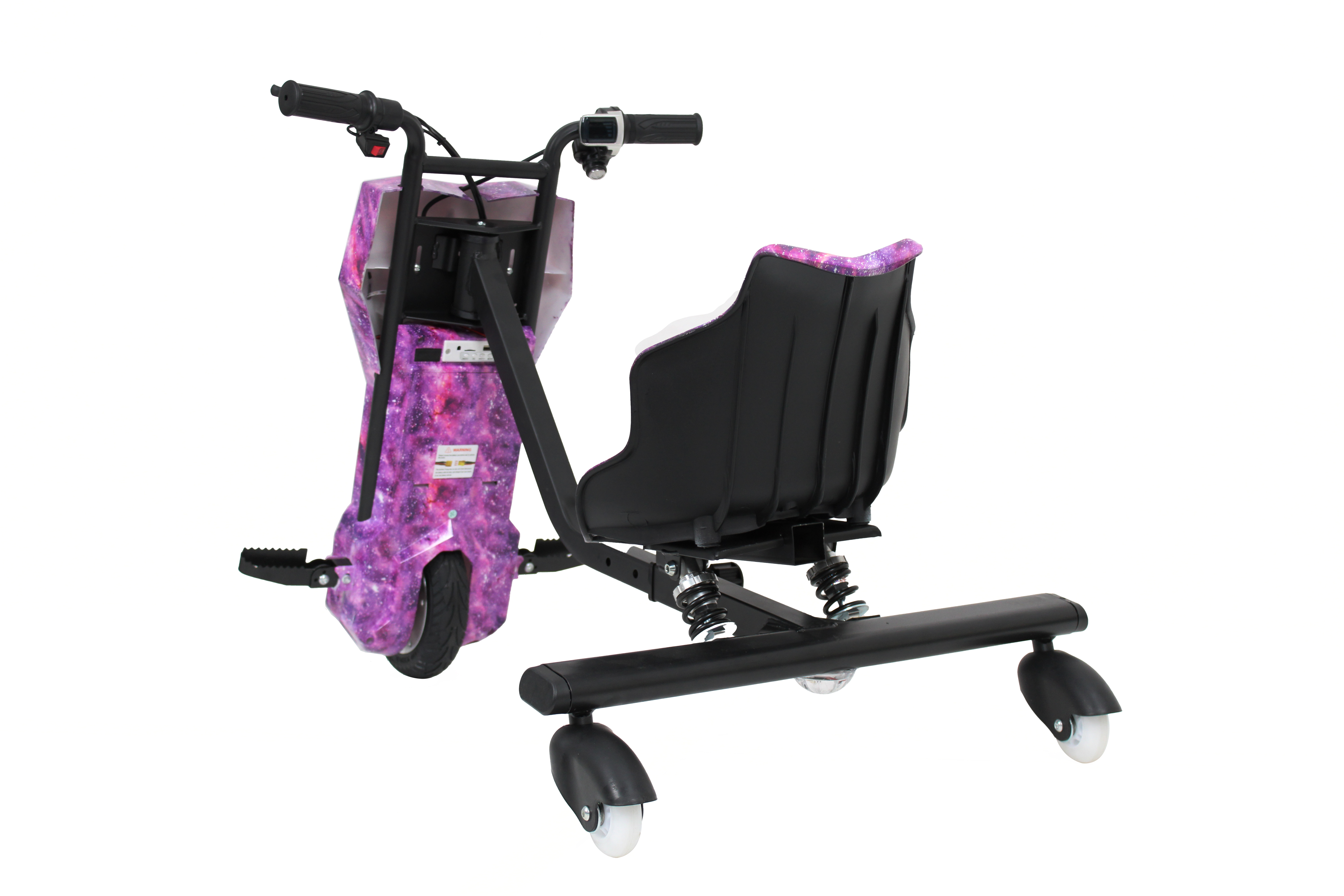 Необычный трицикл, который точно понравится Вашим детям! Достаточно нажать на кнопку на руле - и Вы уже делаете крутые развороты на месте и входите на нем в управляемый занос в поворотах. 350-ваттный мотор позволяет развивать скорость вплоть до 20 км/ч, а литиевый аккумулятор позволяет наслаждаться катанием на протяжении более часа. Однако при этом трицикл безопасен для ваших детей. Удобное сиденье плотно охватывает райдера и надежно держит его при самых умопомрачительных пируэтах. Рама трицикла сделана из прочной стали, а кожух двигателя - из ударопрочного пластика, который не боится случайных ударов и столкновений.