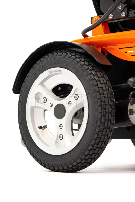 Кресло-коляска оснащено двумя двигателями мощностью 400 Вт. Максимальная скорость этой модели составляет 7 километров в час. На одной зарядке кресло-коляска способно преодолеть расстояние до 20 километров. Однако дальность хода может меняться в зависимости от скорости движения, веса пользователя, качества дороги и манеры вождения.