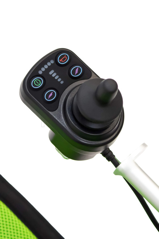 Контроллер находится рядом с подлокотниками, и его можно установить, при необходимости, с любой удобной для пользователя стороны. На нем размещены джойстик для управления коляской, кнопка звукового сигнала, кнопка включения/выключения, а также кнопки регулировки скорости.