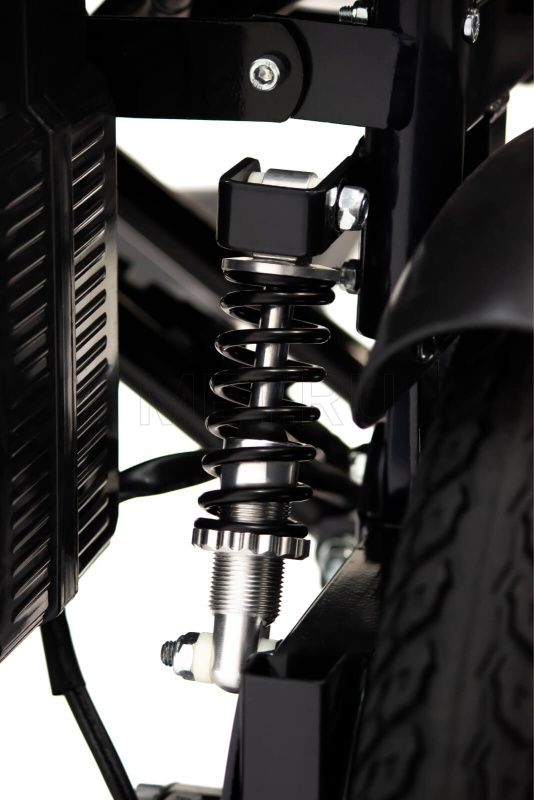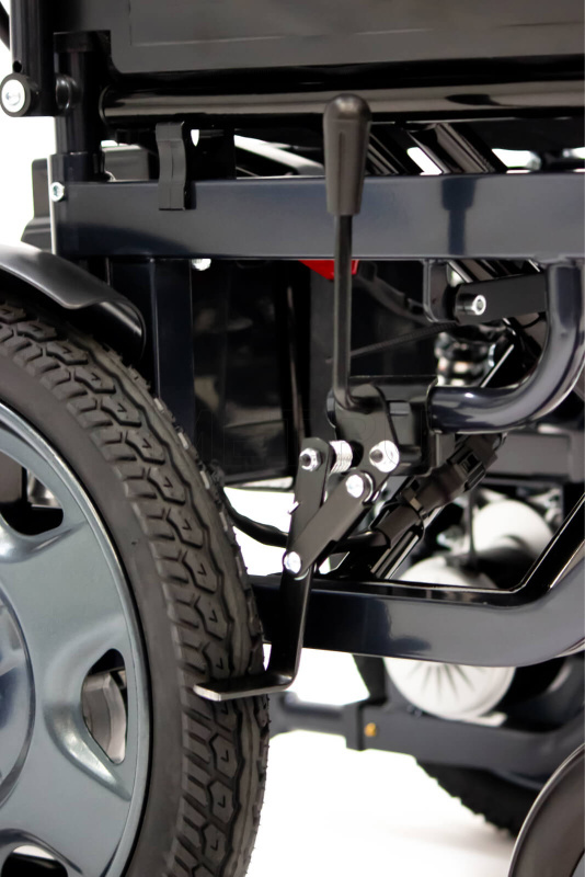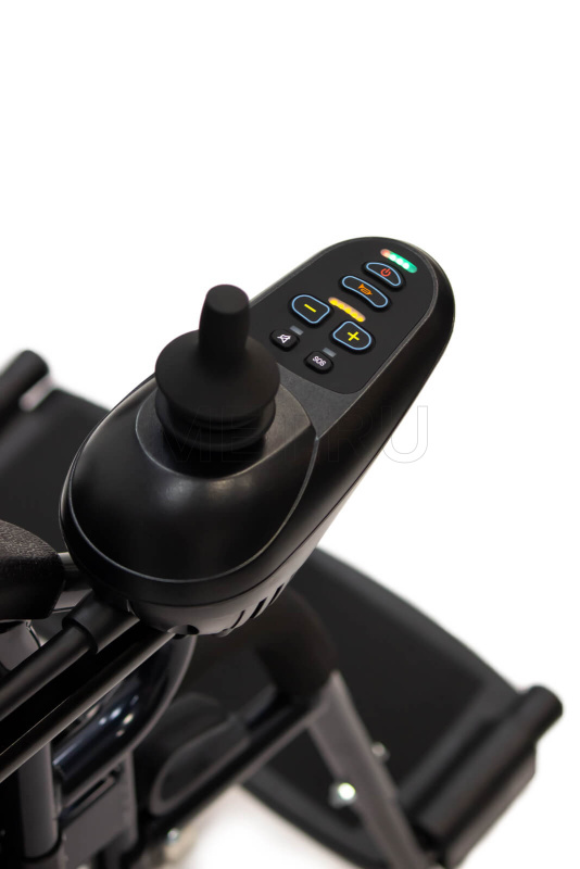 Модель оснащена антиопрокидывателями, которые делают коляску более устойчивой и не дают ей перевернуться. Контроллер находится рядом с подлокотником, и его можно установить, при необходимости, с любой удобной для пользователя стороны. На нем размещены джойстик для управления коляской, кнопки переключения скоростей и звукового сигнала, а также кнопка SOS, которая активирует звуковое оповещение в случае, если человеку требуется помощь.