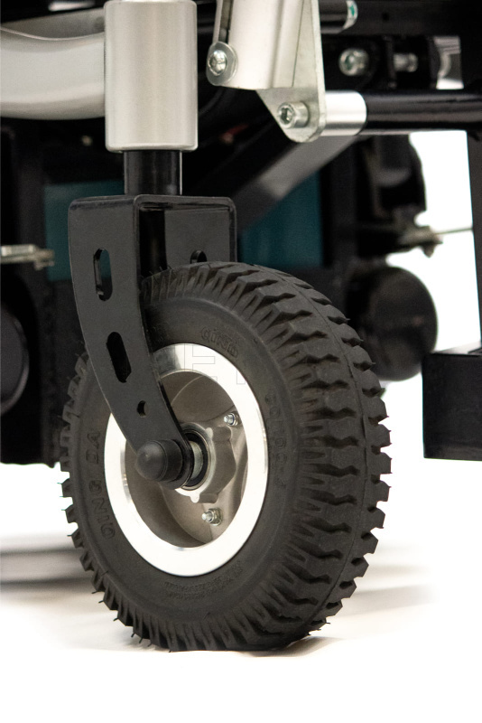 - Передние поворотные колёса диаметром 210 мм с надувными протекторами