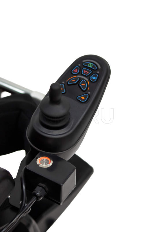На панели контроллера расположены: джойстик, кнопка звукового сигнала, кнопка включения/выключения, регуляторы скорости, кнопка аварийной остановки, поворотники и кнопка включения фар.
