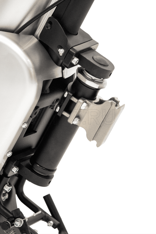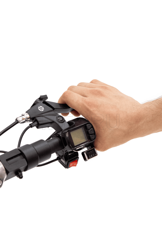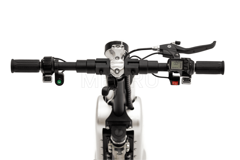 Мотоциклетный руль, пневматический протектор, безредукторная надёждная конструкция, 400W электромотор и 15 Ah лёгкий литий-ионный аккумулятор.