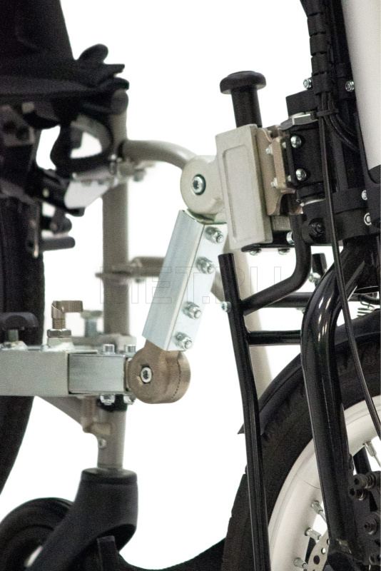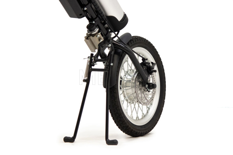 - Быстросъемное крепление к передку механического кресла-коляски позволяет снимать мото-колесо с конструкции, не сходя с кресла.