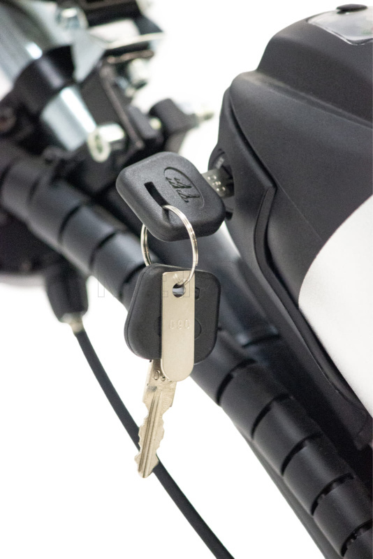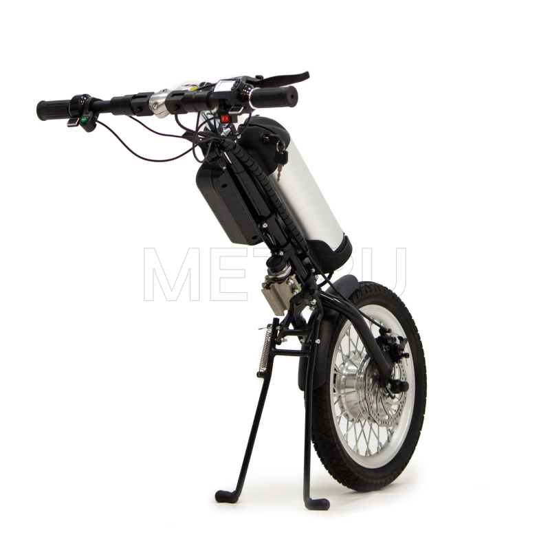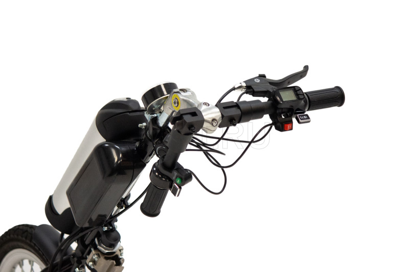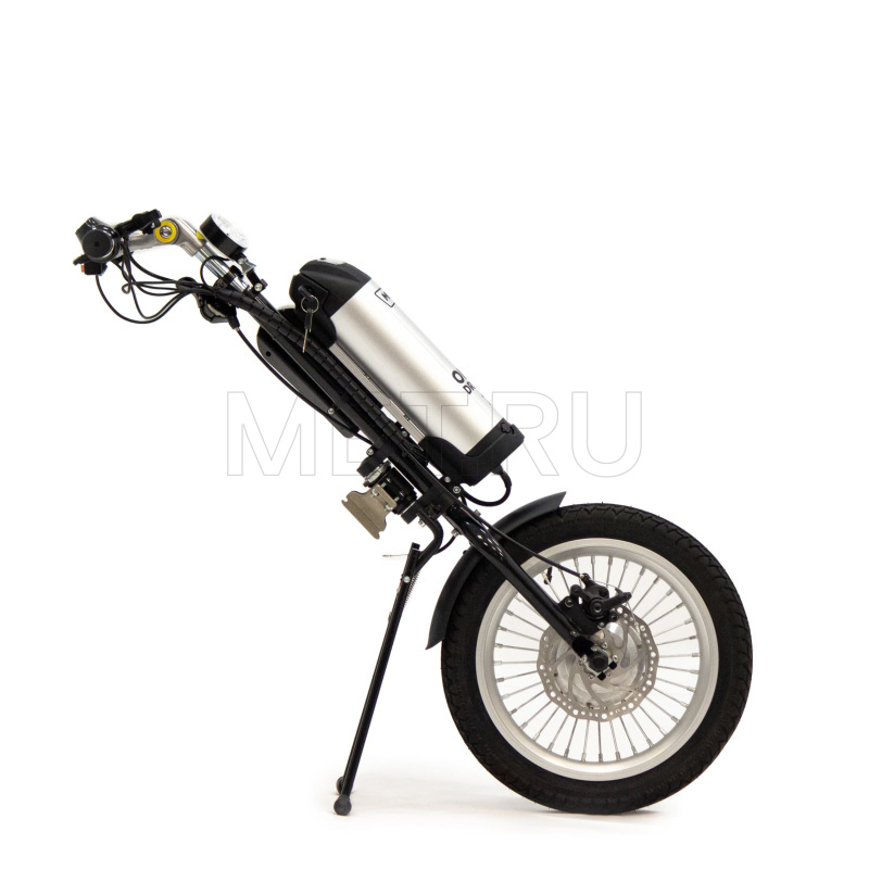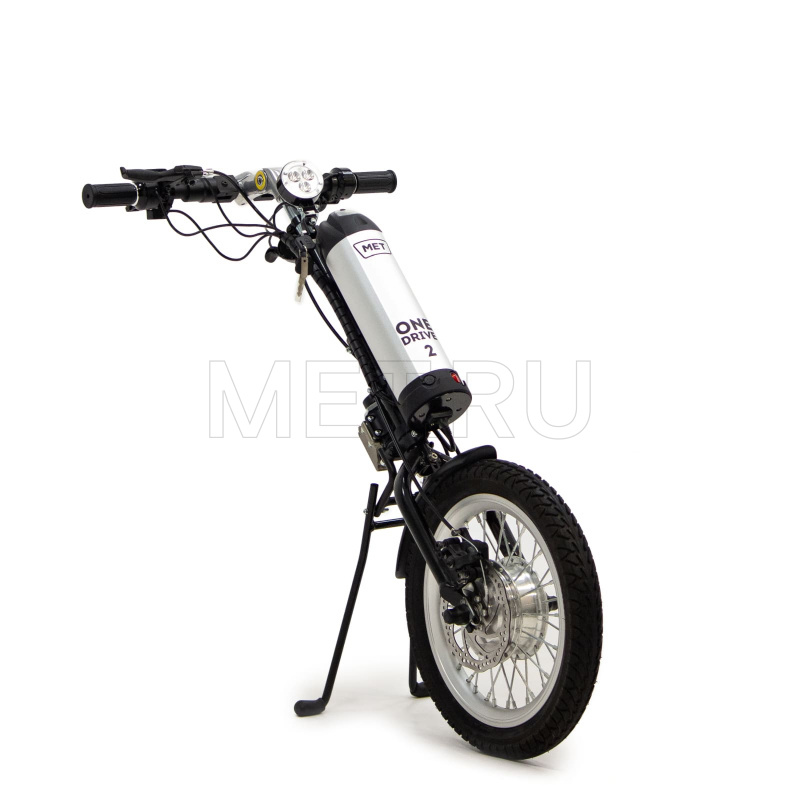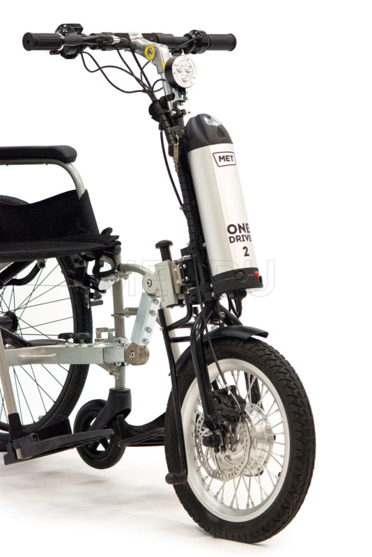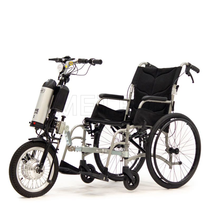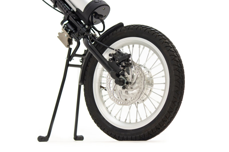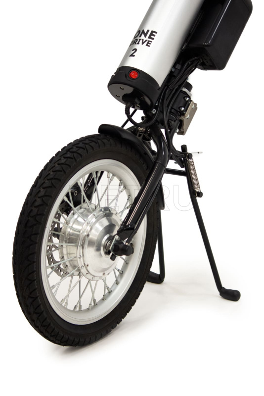 Электропривод представляет из себя 16-дюймовое моторколесо с пневматической покрышкой, оборудованное механическим дисковым тормозом, системой крепления к подножкам кресла-коляски и рулём мотоциклетного типа. Мощное диодное освещение для поездок в тёмное время суток.