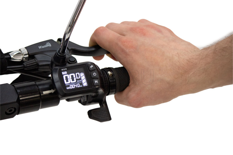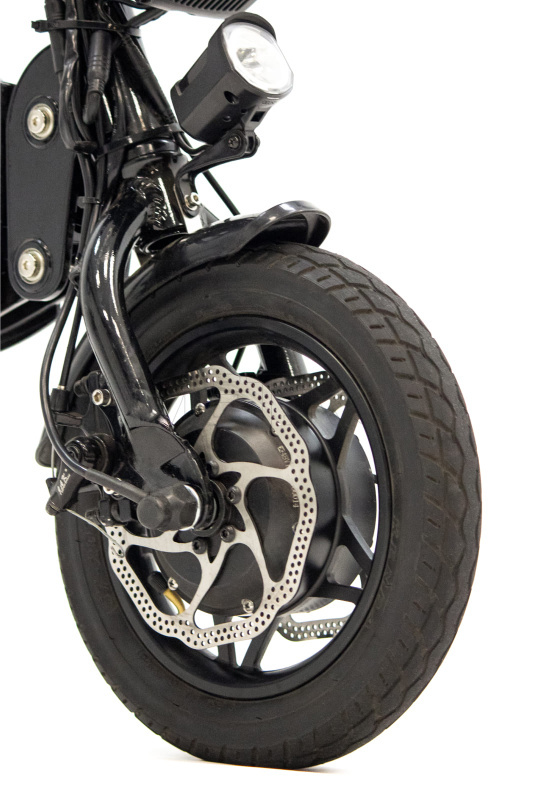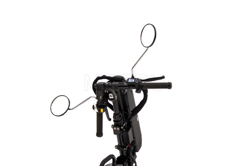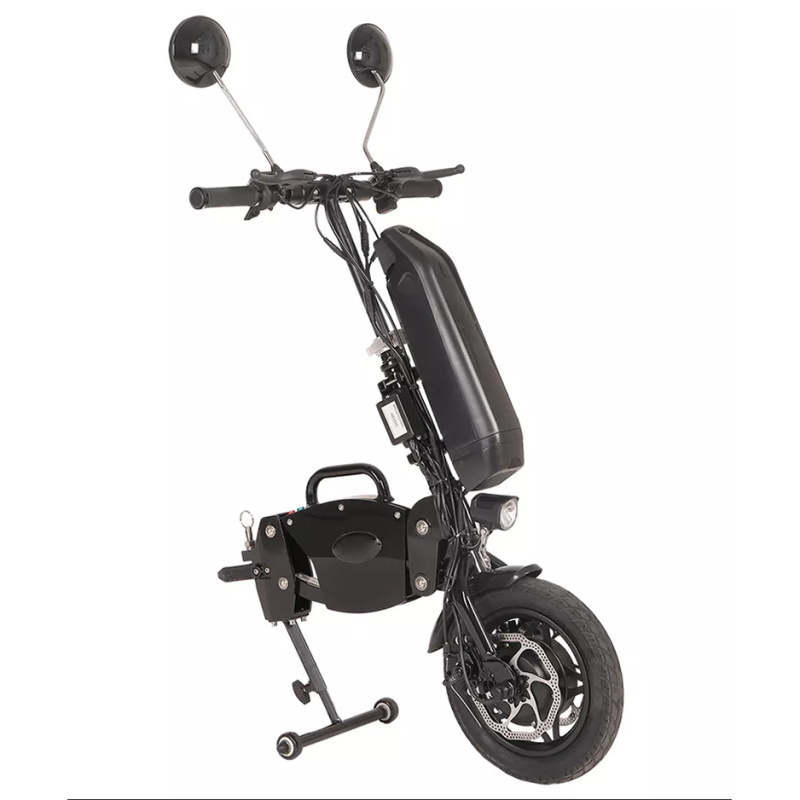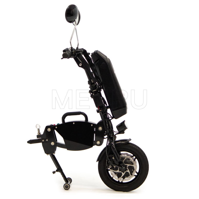 Электропривод представляет из себя 12-дюймовое мото-колесо с пневматической покрышкой, оборудованное механическим дисковым тормозом, системой крепления к подножкам кресла-коляски и рулём мотоциклетного типа с зеркалами заднего вида. Мощное освещение будет полезно для прогулок в тёмное время суток.