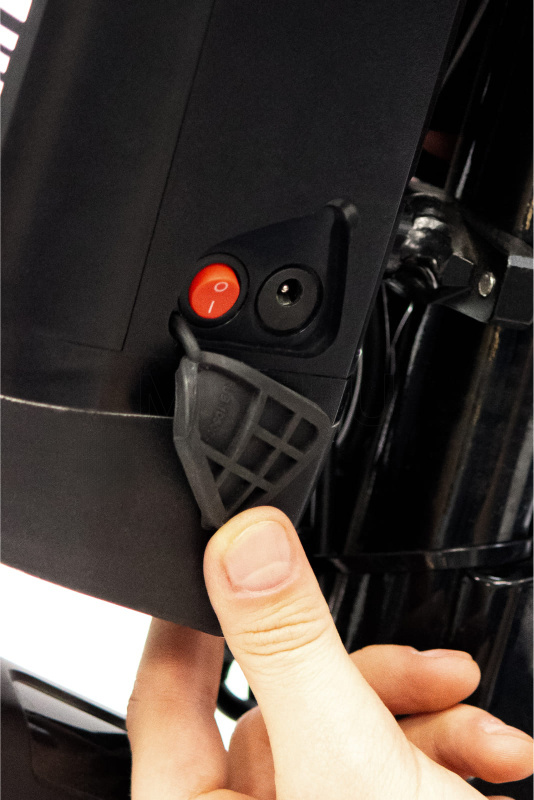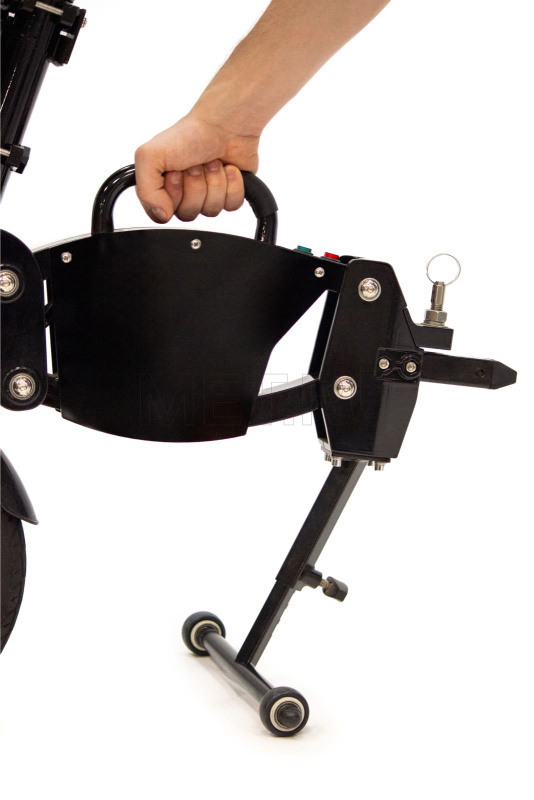 - Быстросъемное крепление к передку механического кресла-коляски позволяет снимать мото-колесо с конструкции, не сходя с кресла.