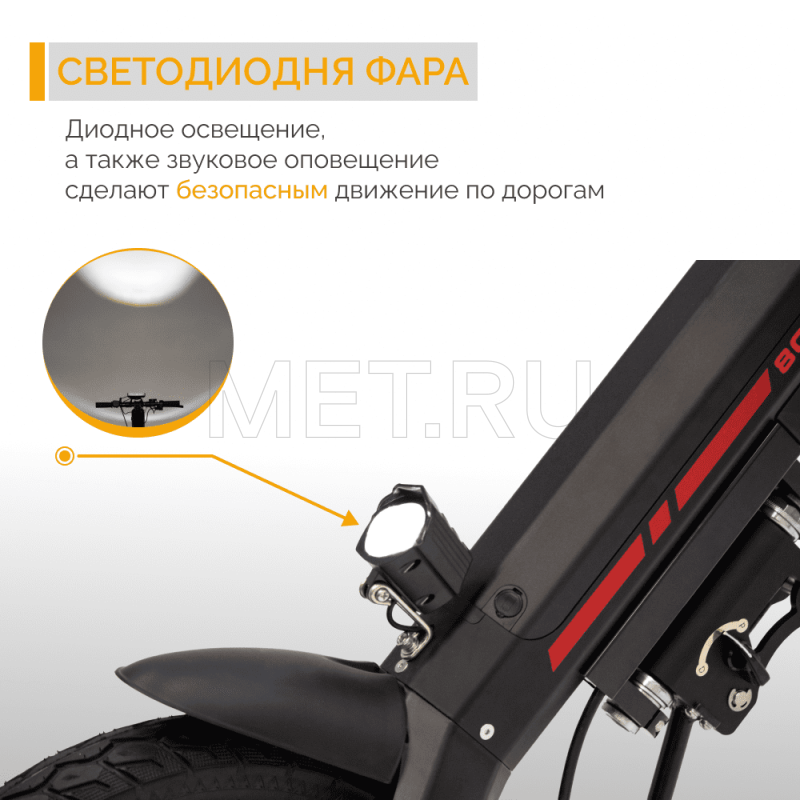 Передняя светодиодная фара с звуковым сигналом - мощное диодное освещение, а также звуковое оповещение сделают безопасным движение по дорогам общего пользования в любое время суток.