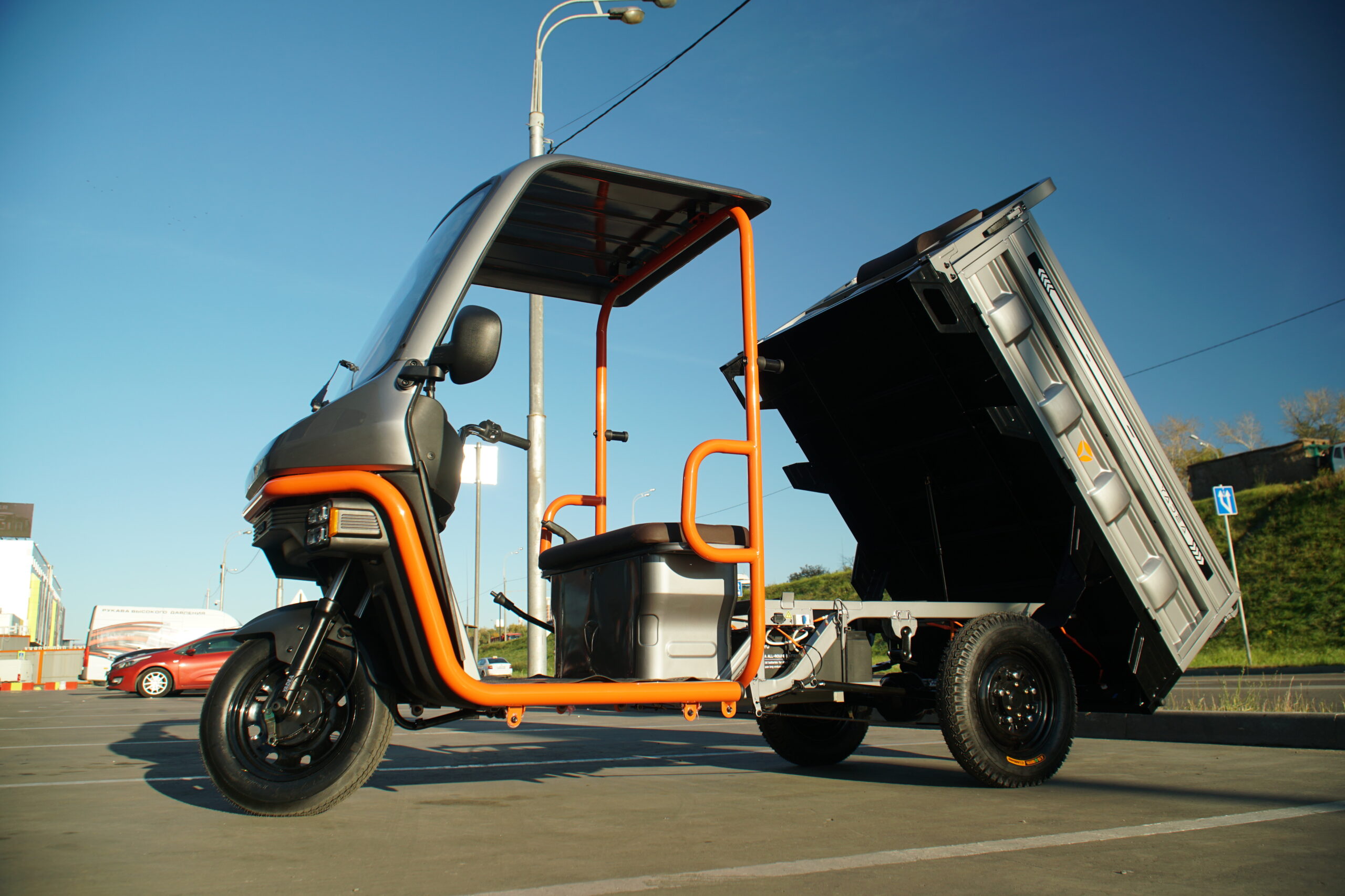 - Комфорт и защита: Наличие полукабины защищает водителя от осадков. Гидравлические амортизаторы, цифровая приборная панель и яркие LED-фары делают каждую поездку комфортной и безопасной.