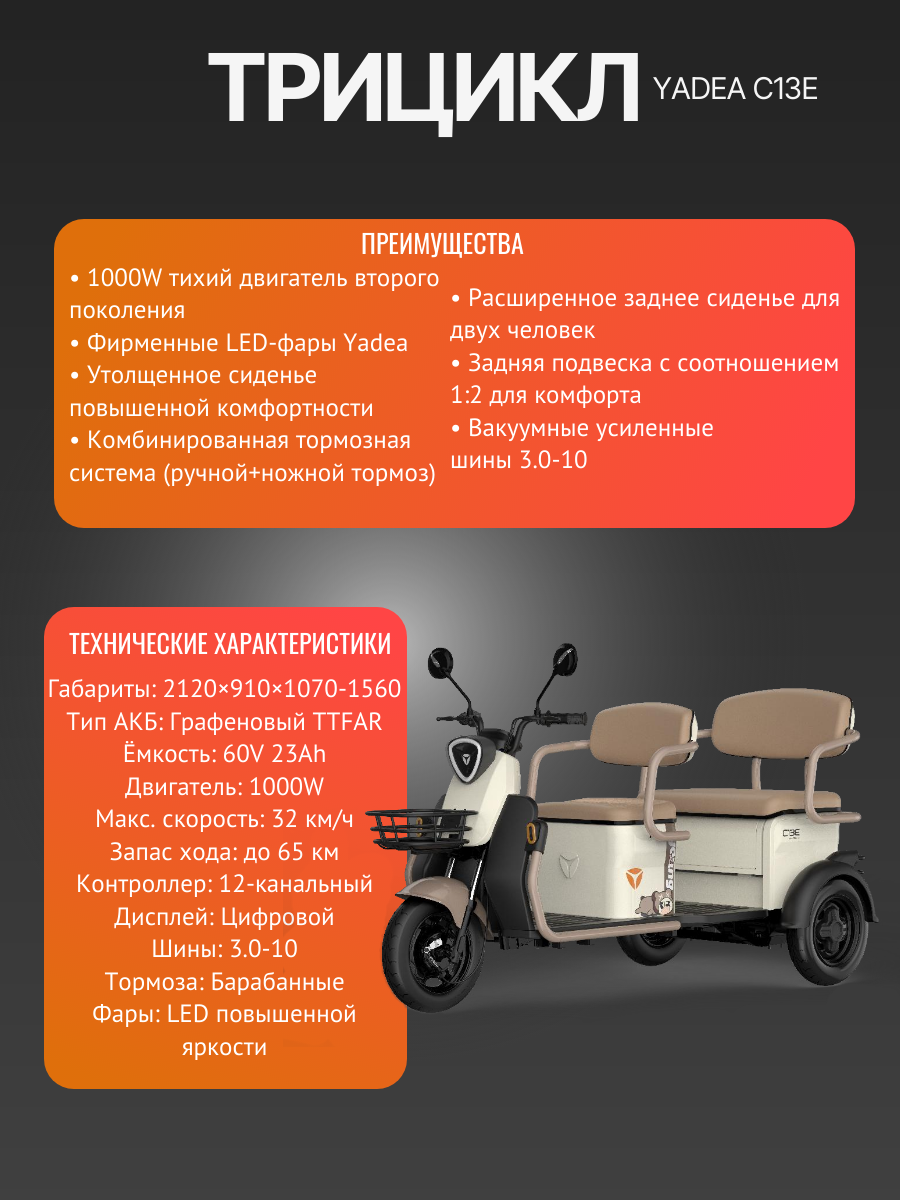Забудьте о неудобствах передвижения за городом! Пассажирский трицикл Yadea С13E создан специально для жизни в коттеджных поселках и сельской местности. Он станет вашим верным спутником для поездки в магазин, визита к соседям, прогулки на рыбалку или пикник на опушку леса. А его исключительная устойчивость и надежность делают его отличным выбором для людей с ограниченной мобильностью.