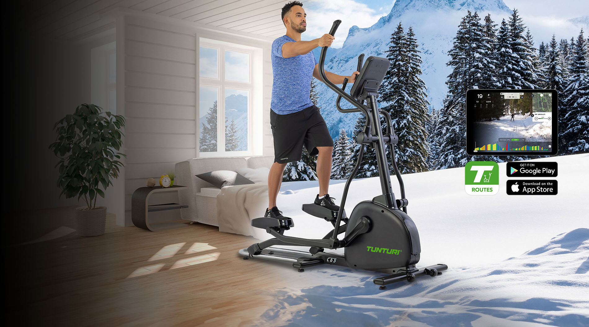 Хотите больше разнообразить свои тренировки? Подключите приложение Tunturi Routes или Zwift, к C65-F с помощью Bluetooth. В бесплатной версии Tunturi Routes у вас есть доступ к 15 видеомаршрутам, а в платной версии вы можете использовать сотни маршрутов. Кроме того, вы можете тренироваться или участвовать в гонках с другими пользователями приложения. Если вы соедините Zwift с тренажером, скорость видео подстраивается под темп, в котором вы тренируетесь. Если вы свяжете приложение iConsole с C65, ИИ создаст для вас персональную программу тренировок на основе достигнутых результатов тренировки.