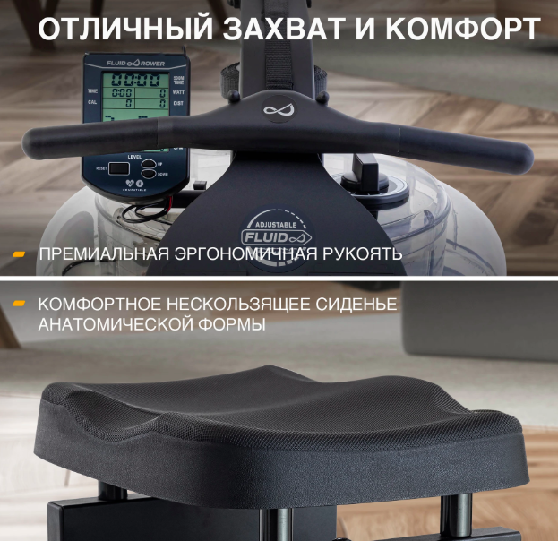 FluidRower Neon Pro XL создаёт полное ощущение настоящей гребли благодаря запатентованной системе XL Twin Tank. Вода внутри резервуара движется между двумя камерами — пассивной и активной — что позволяет точно регулировать сопротивление с помощью поворотного регулятора прямо во время тренировки.