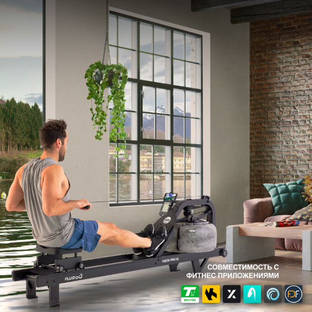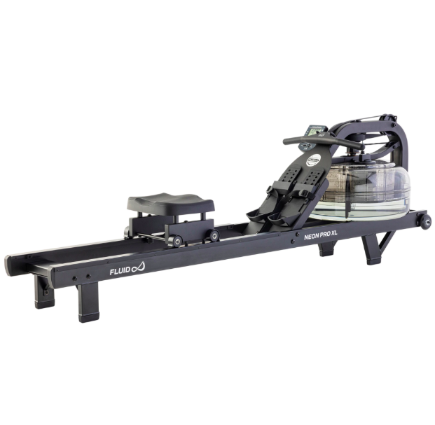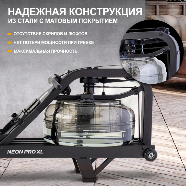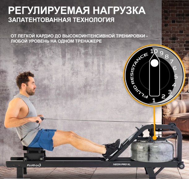 ребной тренажер FluidRower Neon Pro XL — это профессиональная модель с регулируемым водным сопротивлением. Он установлен на приподнятых опорах, оснащён увеличенным резервуаром XL Twin Tank, обеспечивающим на 65% больше нагрузки, и выполнен из прочной стали с матовым чёрным покрытием в индустриальном стиле.