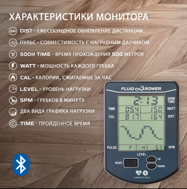 Монитор отображает все параметры тренировки: время, дистанцию, калории, гребки в минуту, уровень сопротивления и мощность. Уникальная функция Power Graph показывает фазу каждого гребка в реальном времени — это помогает улучшить технику и повысить эффективность занятий.