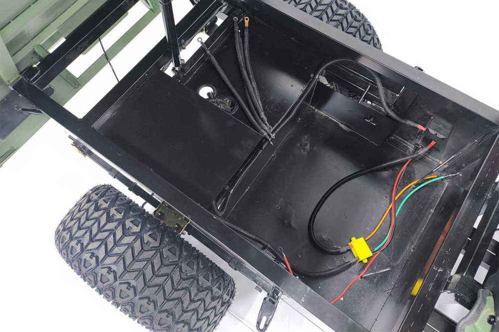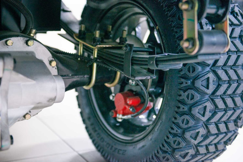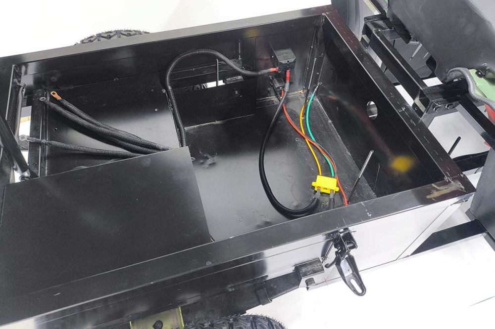 Аккумуляторы подбираются отдельно, что даёт вам свободу выбора технологии и ёмкости. Электроквадроцикл можно оборудовать как экономичными свинцовыми (AGM), так и более долговечными литиевыми (LiFePO4) аккумуляторными батареями ёмкостью 80 или 100 А·ч, что позволяет гибко формировать бюджет покупки и необходимый запас хода. Масса самого квадроцикла без АКБ составляет 320 кг — это даёт отличную устойчивость на неровностях. Размер грузового отсека внушает уважение: в кузове длиной почти 1,3 метра и шириной 1,1 метра вы без проблем перевезёте стройматериалы, урожай, корма или инвентарь.