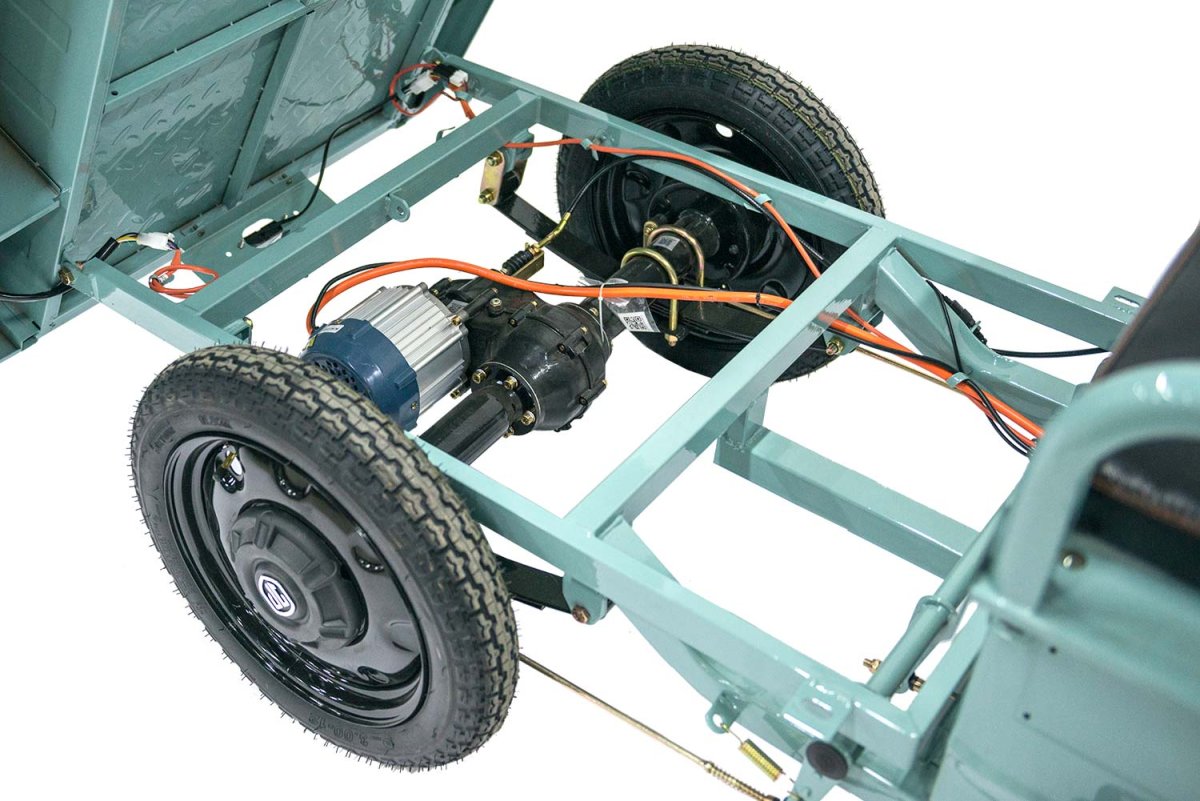 Трицикл оснащен электромотором мощностью 650 ватт, который идеально справляется с задачами, соответствующими габаритам и назначению техники. Его мощности за глаза хватает для перевозки грузов весом до 250 кг, а наличие пониженной передачи позволяет уверенно преодолевать подъемы и неровные поверхности.