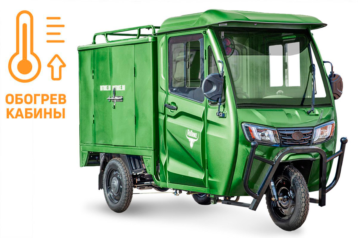 Карго Кабина Дуал Обогрев - привлекательный и практичный современный электрический трицикл с герметичной кабиной и кузовом типа фургон. Фургон имеет боковые распашные двери и вместительное внутреннее пространство 1500х1000х930 мм.