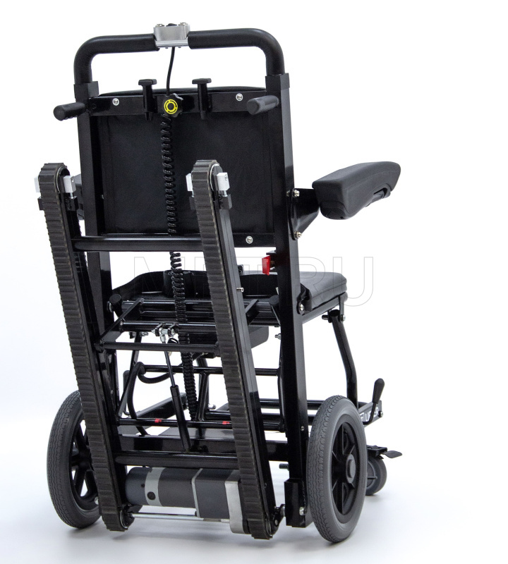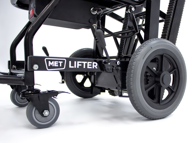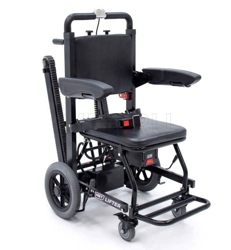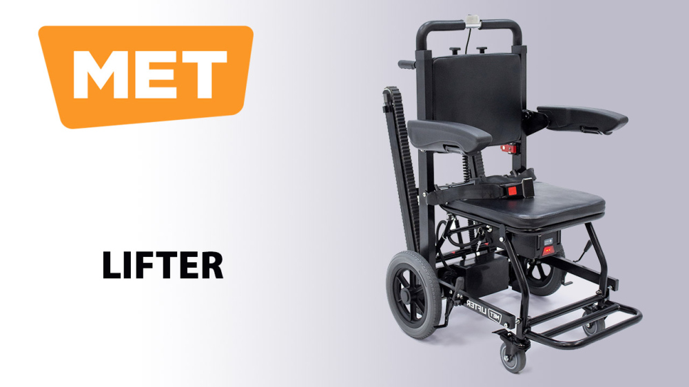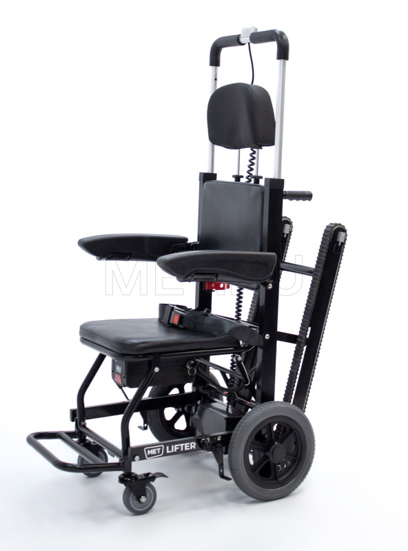 MET LIFTER – мобильное подъемное устройство на гусеничном ходу для безопасного перемещения людей с ограниченной мобильностью по лестницам при помощи сопровождающего лица. MET Lifter с легкостью преодолевает угол наклона лестницы 35°.