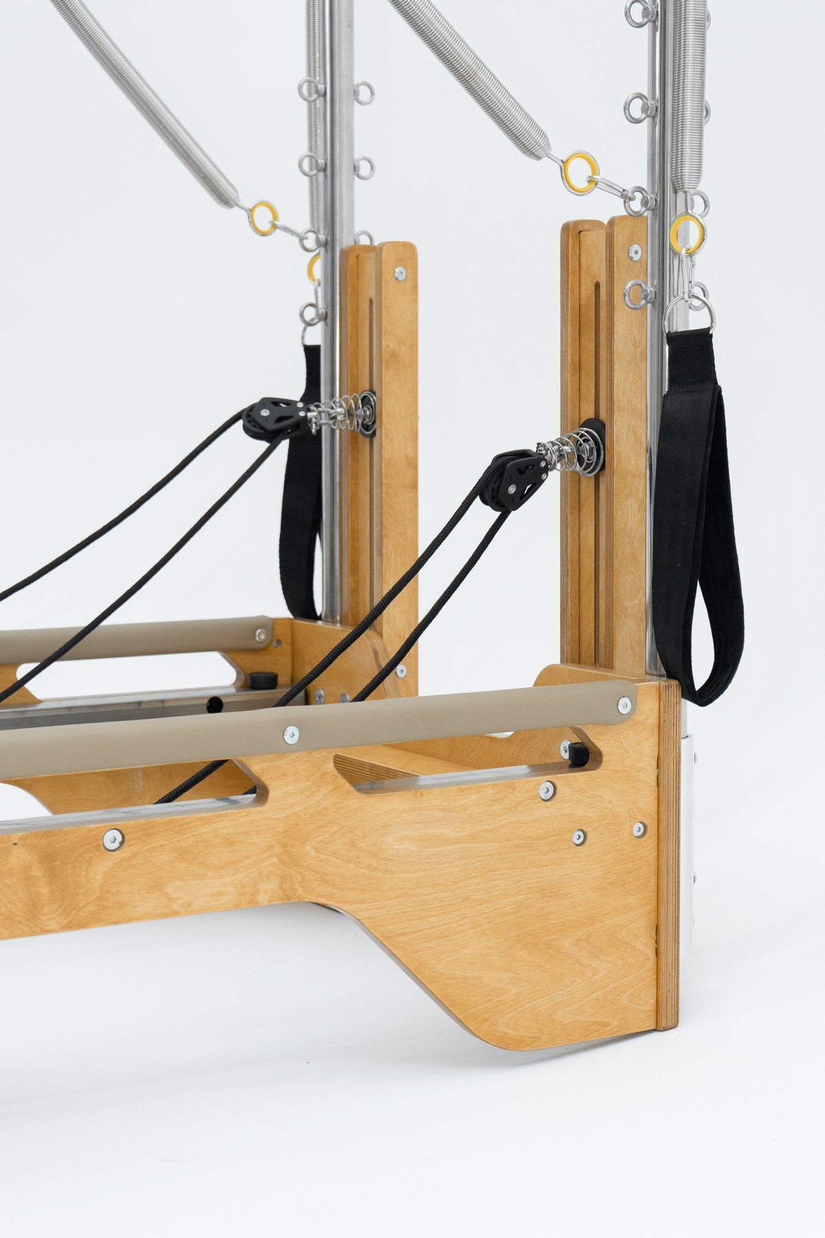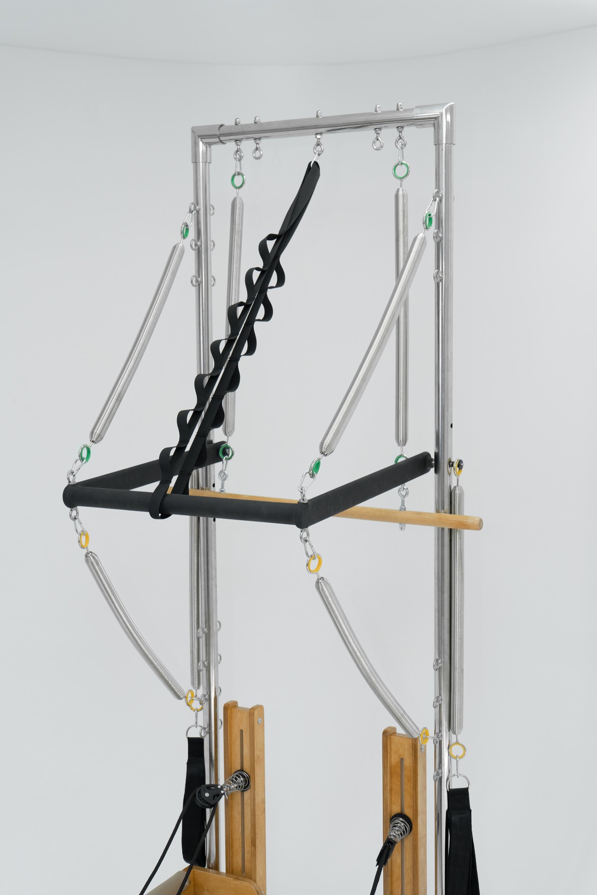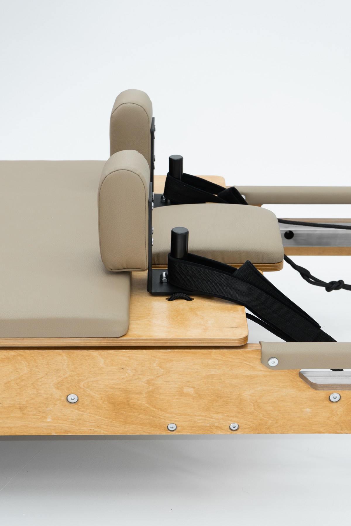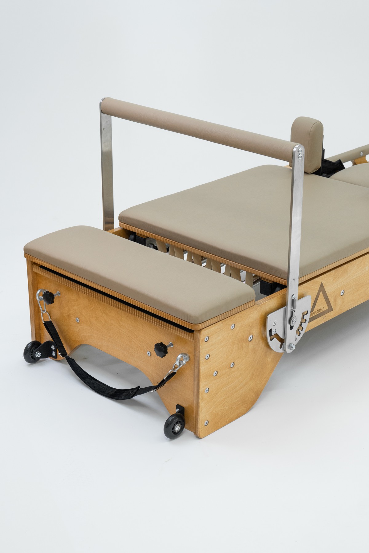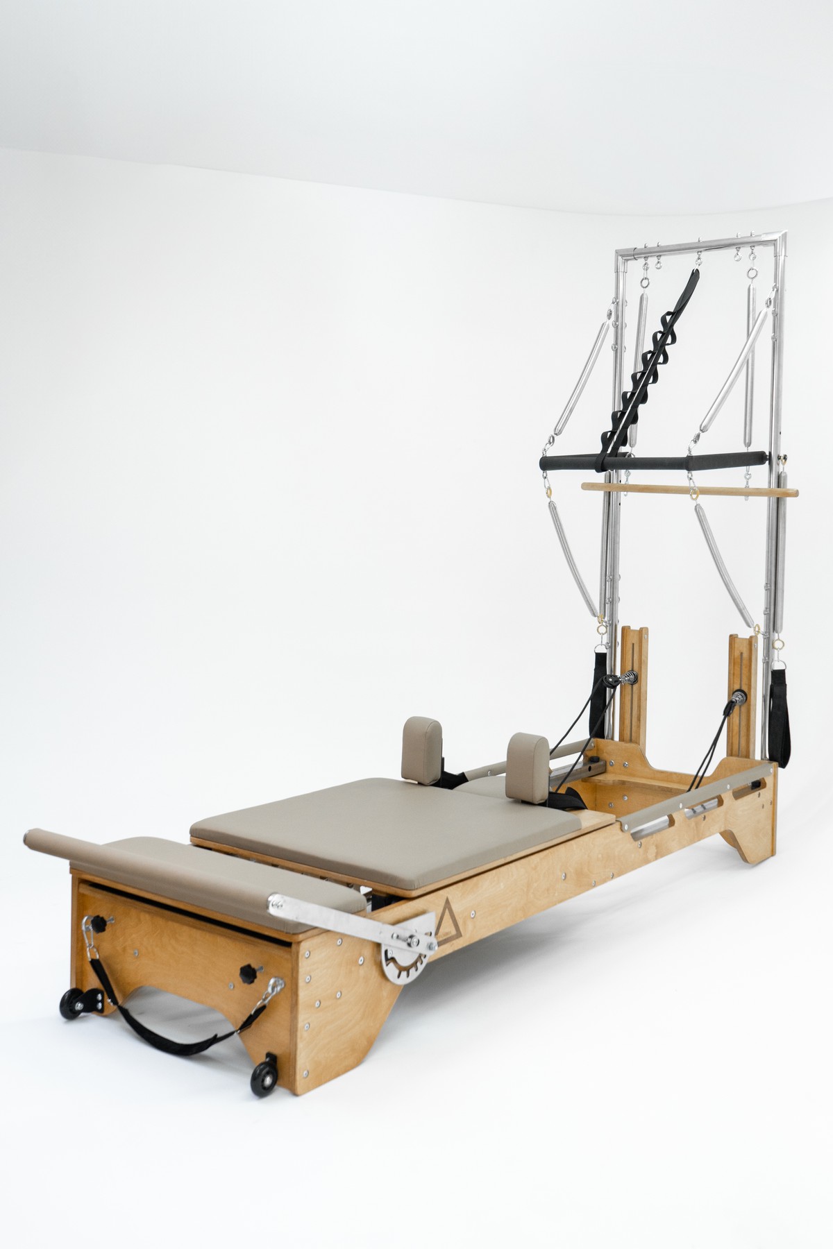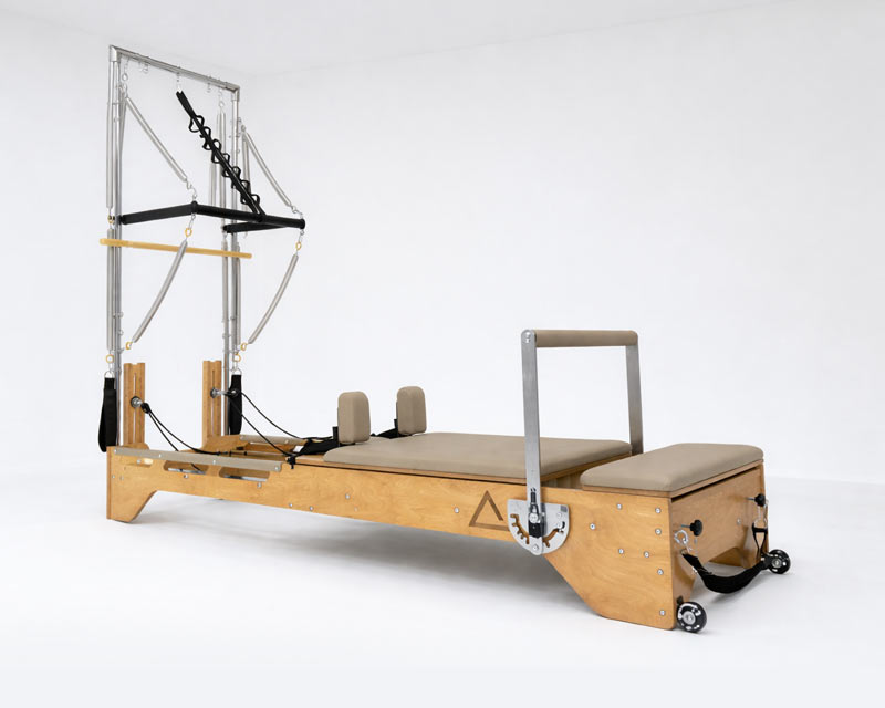 Реформер с Трапецией объединяет два типа оборудования, обеспечивая максимальное разнообразие упражнений. Компактное решение для небольших студий, идеально подходит для групповых занятий пилатес.