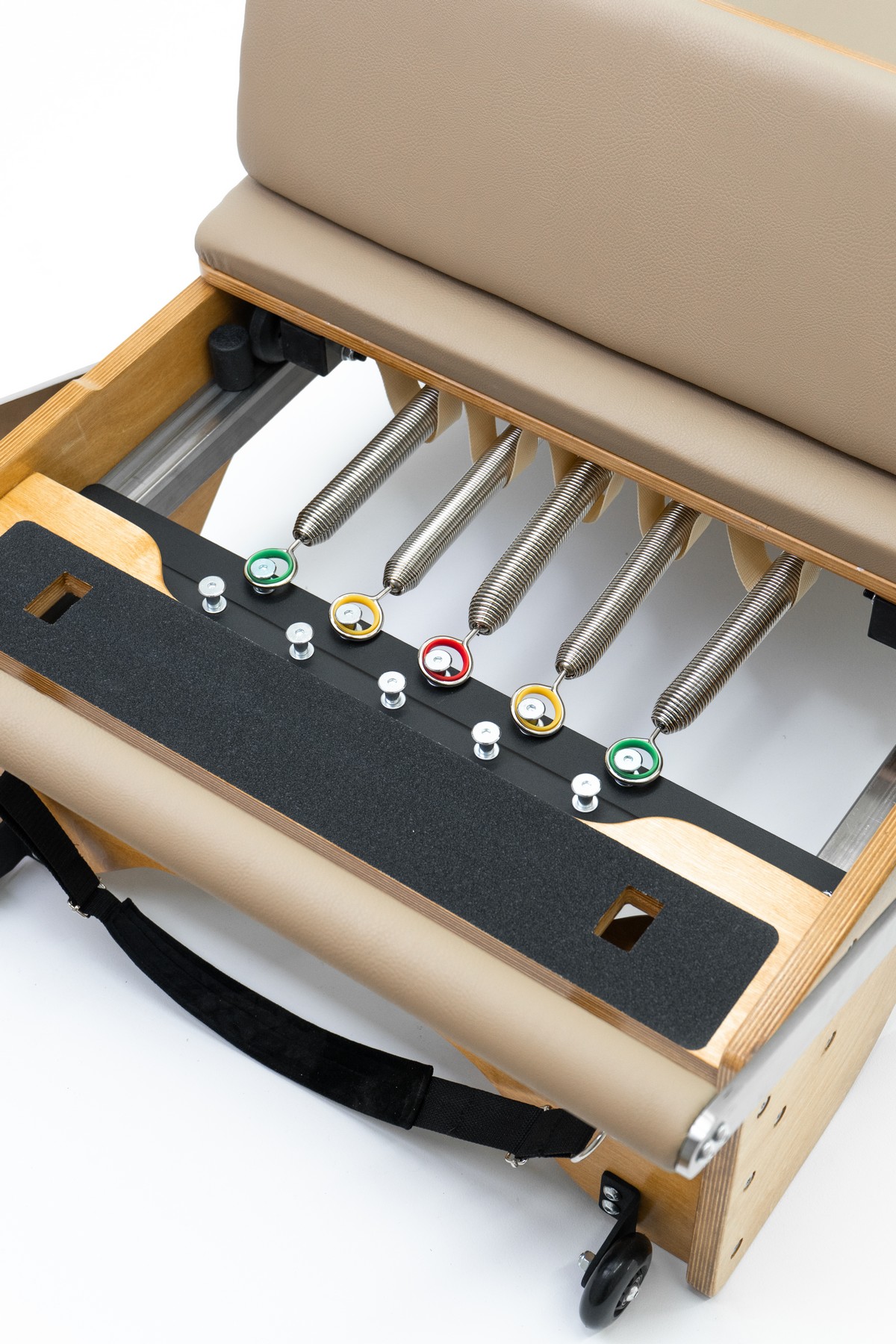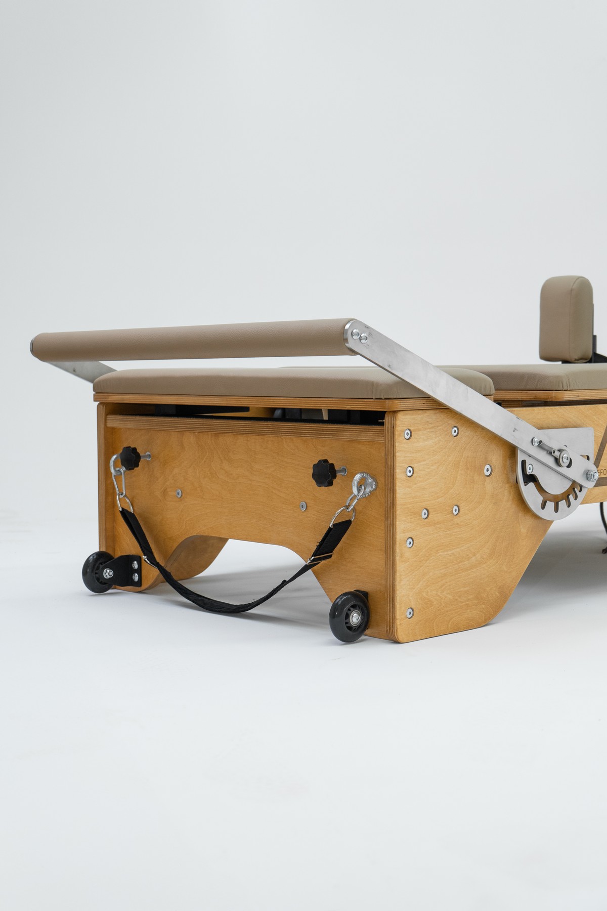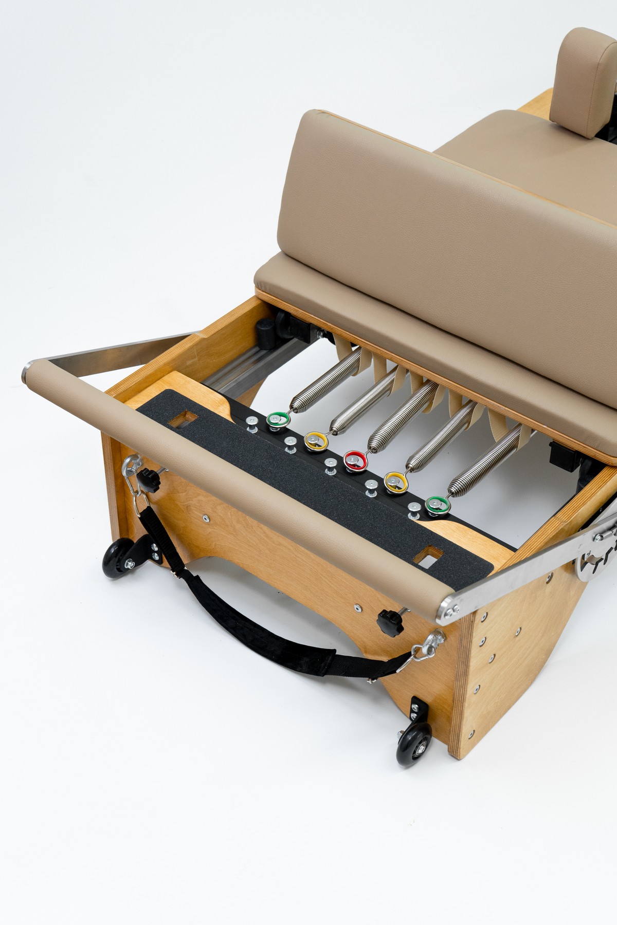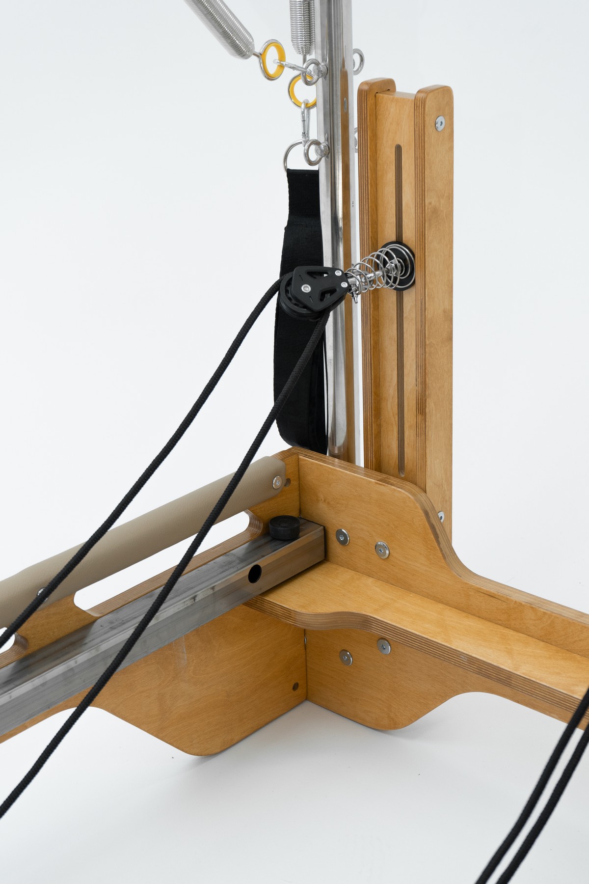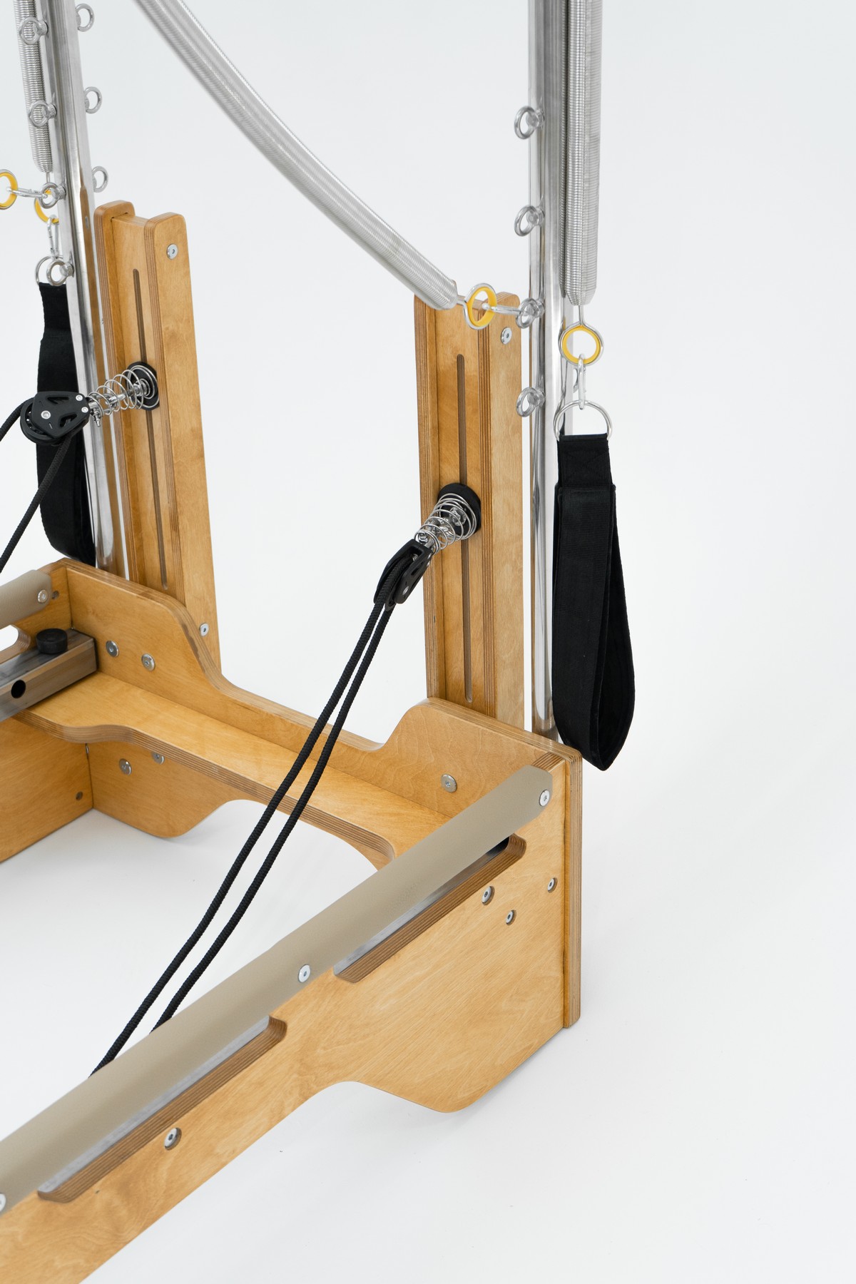 Реформер с Трапецией объединяет два типа оборудования, обеспечивая максимальное разнообразие упражнений. Компактное решение для небольших студий, идеально подходит для групповых занятий пилатес.