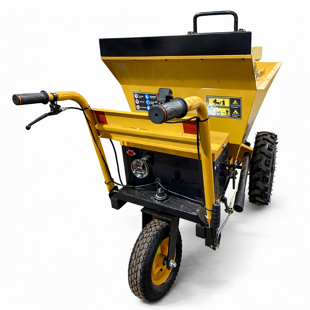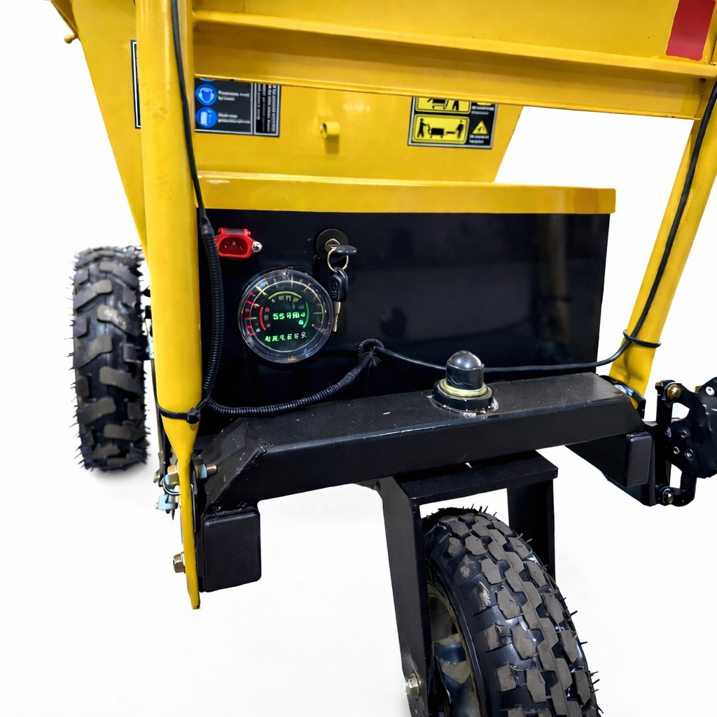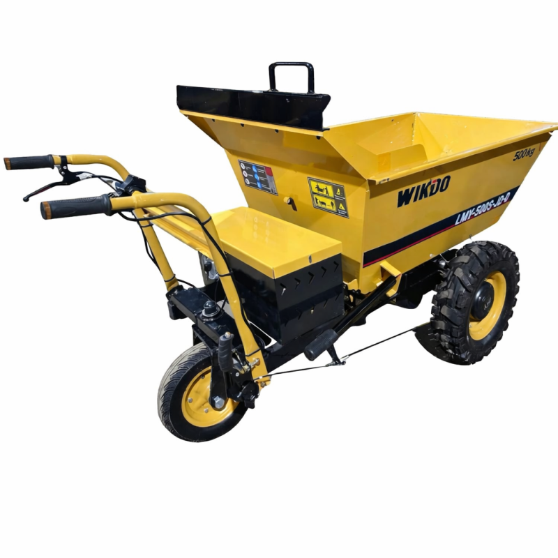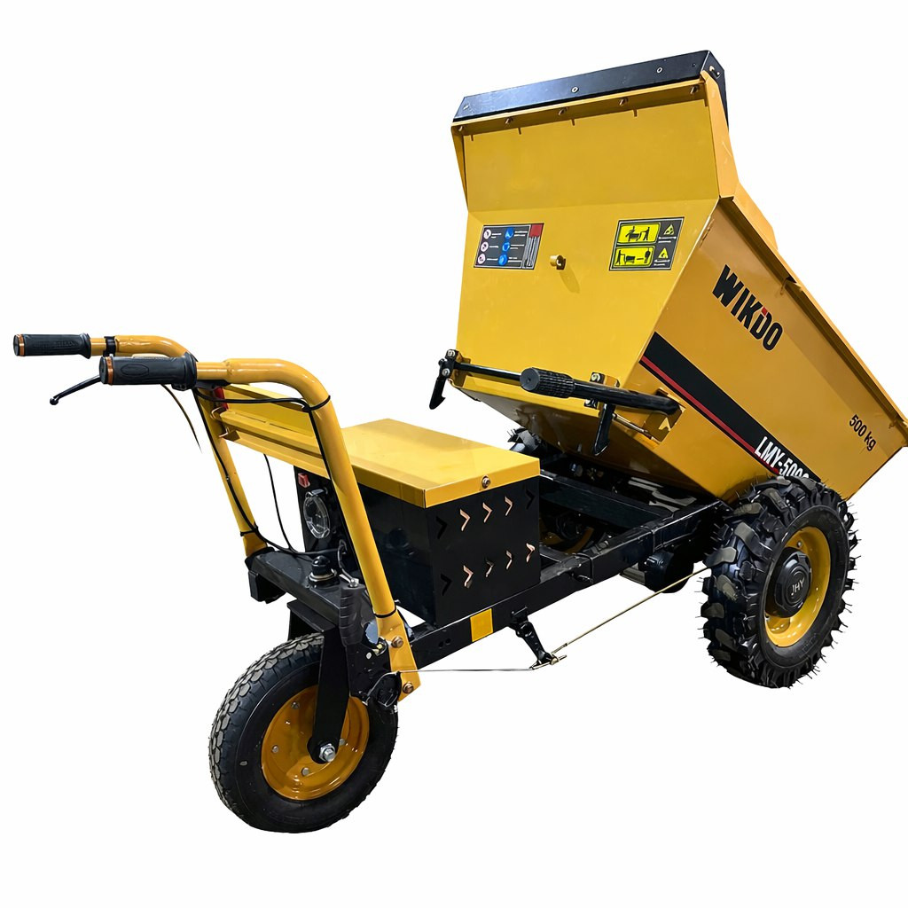 ХарактеристикиГрузовая самоходная электрическая тележка WIKDO LMY - 500S JD D грузоподъемностью 500 кг представляет собой моторизированный агрегат для перевозки различных грузов на грузовой платформе. В основе лежит несущая стальная профильная рама, позволяющая выдерживать большие нагрузки. Энергоустановкой служит надежный электрический двигатель, мощность 1000 Вт. Двигатель совмещен с приводным мостом посредством редуктора, соответственно крутящий момент от двигателя через редуктор передается на приводной мост, который оснащен полноценным дифференциалом и барабанными тормозами. Энергию для работы электродвигатель получает от мощных литий-ионных аккумуляторов (в стандартной комплектации), которые гарантируют долгий срок службы. В комплекте к электрической тележке поставляется блок зарядки аккумуляторов (стандартная комплектация). На данной модели в качестве движителей установлены резиновые пневматические шины с мощными грунтозацепами, позволяющие перевозку груза в сложных условиях. Мототележка WIKDO LMY - 500S JD D подойдет для использования как условиях хороших дорожных покрытий так и при работе на неровных покрытиях, включая, песок щебень и пр. Все перечисленные технические составляющие позволяют использовать электрическую тележку WIKDO LMY - 500S JD D как грузовой агрегат платформенного типа грузоподъемность 500 кг. Платформа оснащена рифленым покрытием для предотвращения самопроизвольного смещения не закрепленного груза и боковыми ограничительными поручнями, которые легко могут принимать горизонтальное состояние, тем самым предоставляя возможность для перевозки негабаритных грузов. Управление данной машиной простое, легкое и интуитивно понятное. Две ручки и поворотное колесо позволяют оператору максимально контролировать управление, что особенно важно в тяжелых условиях бездорожья и при неровностях. При необходимости высоту ручек можно отрегулировать и подстроить индивидуально. Для начала движения, оператор включает зажигание, выбирает кнопкой направление движения (вперед/назад), передачу медленнее/быстрее и поворачивая курок газа начинает плавное движение в выбранном направлении. Мы ставим на первое место комфортную и безопасную работу с техникой WIKDO и поэтому в стандартную комплектацию мы включили защищенный аккумуляторный ящик, ограничительную рамку для безопасности оператора и ручной тормоз. Также мы установили необходимые информационные таблички и светоотражающие элементы. С нашими машинами тяжелая работа становится легче и комфортнее!
