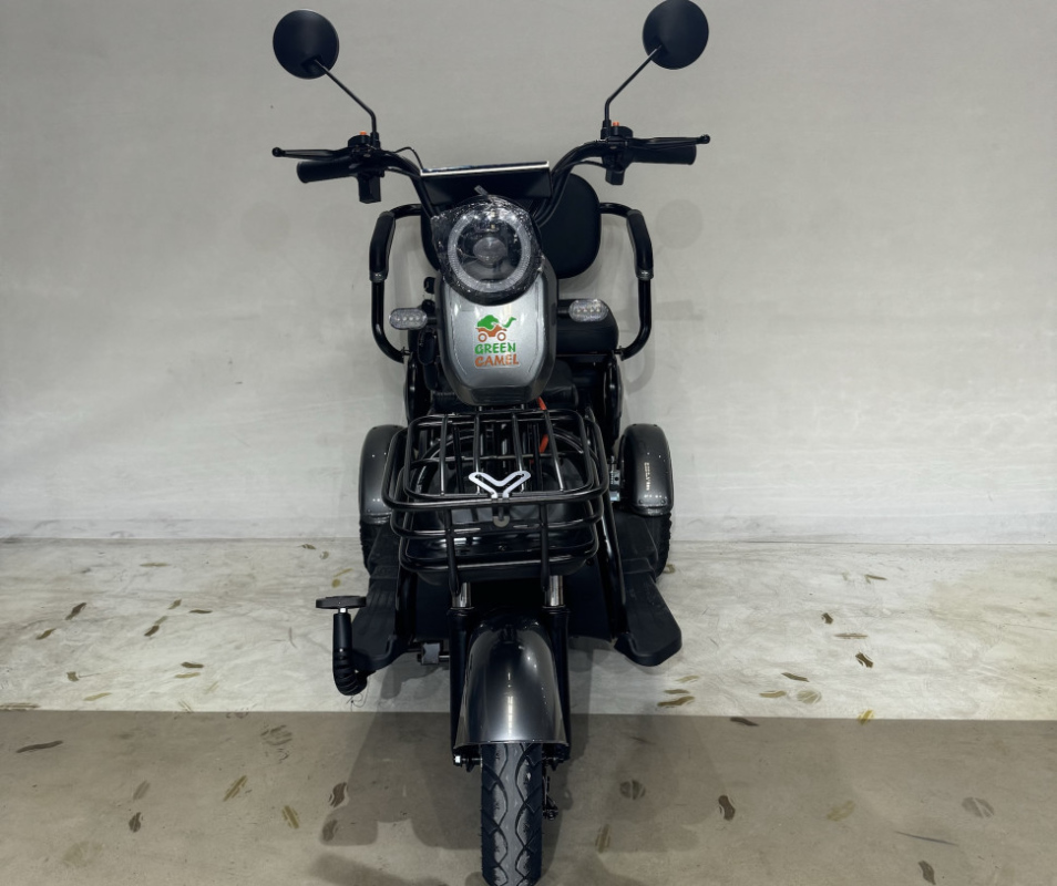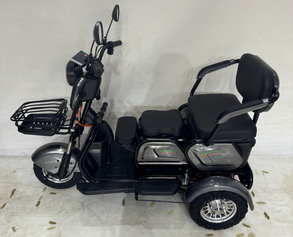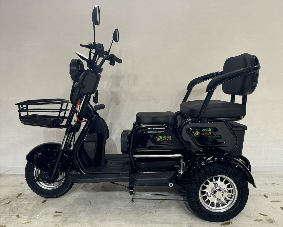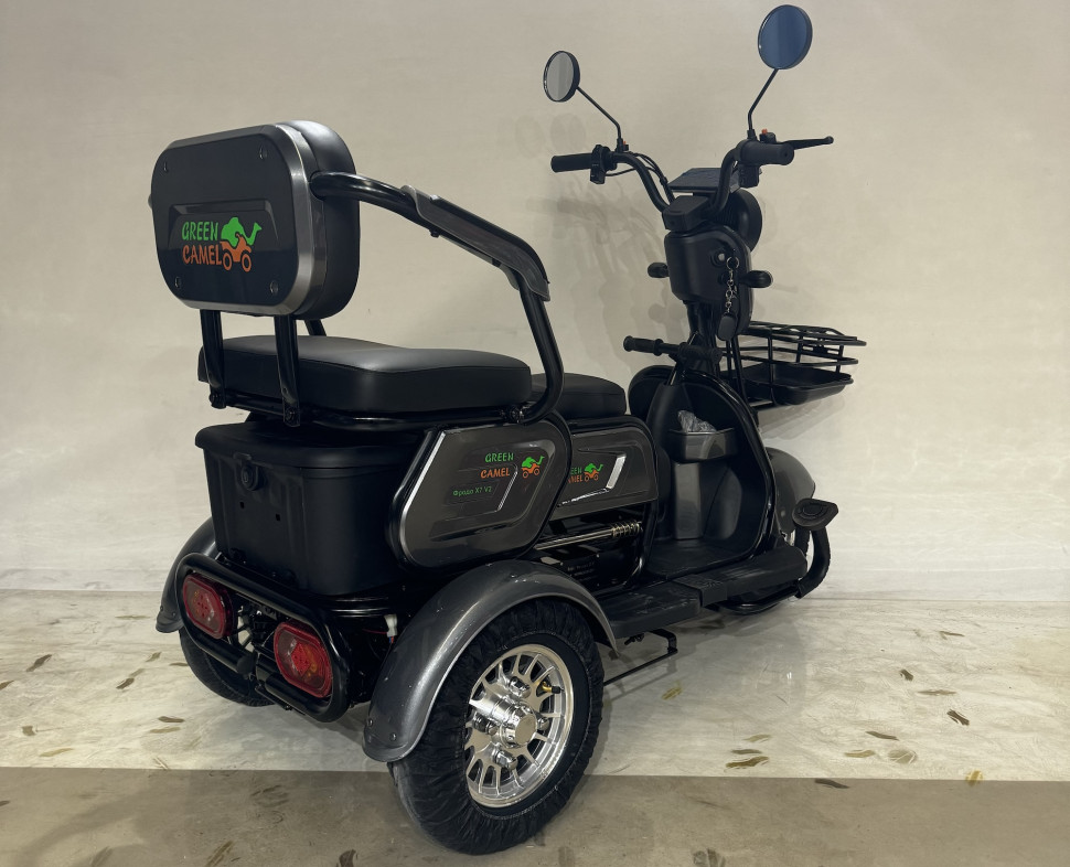 Электротрицикл Фродо X7 от команды GreenCamel – это образец универсального городского электротранспорта для семьи из трех человек. Модель Фродо X7 путём нескольких манипуляций может трансформироваться из трицикла с широким креслом для водителя в семейный транспорт со сдвижным сиденьем для пассажира и раскладным сиденьем для ребёнка перед водителем. В комплектацию трицикла входит передняя корзина и задняя большая корзина. Оптимальная колёсная формула с одним передним колесом и ведущей задней парой обеспечивает устойчивость в поворотах. Задняя пара гидравлических амортизаторов отвечают за комфорт в поездках. Передний и задний барабанные тормоза и ножной рычаг заднего тормоза отвечают за быстрые безопасные установки. Дальность пробега на штатной гелевой SLA батарее с ёмкостью 20Ач до 50 км. Трицикл оснащен яркой светодиодной фарой с режимами дальнего и ближнего света, ходовыми огнями, поворотниками, стоп-сигналом, зеркалами заднего вида и может перемещаться на выделенной полосе дороги при наличии водительского удостоверения и возрасте водителя старше 16 лет (согласно изменениям в ПДД с 1.03.23 г.). Трицикл Фродо X7 оборудован сигнализацией с брелоком управления, так что вы не будете переживать за сохранность вашего индивидуального транспорта. Очевидным плюсом покупки индивидуального электротранспорта от компании GreenCamel является расположение компании и осуществление гарантийного обслуживания на территории РФ с постоянно пополняемым складом продукции и отделом ремонта аккумуляторных батарей. А также оперативная онлайн поддержка в мессенджерах на протяжении всего срока службы техники.